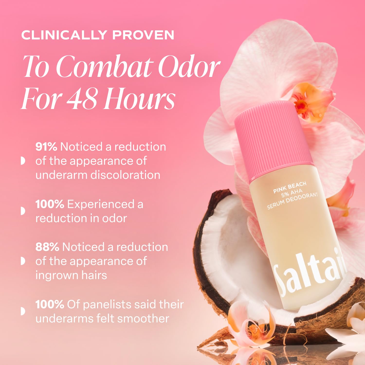 - LONG-LASTING ODOR PROTECTION: Clinically proven for up to 48-hour odor control, Saltair Serum Deodorant combines AHA’s with Xylitol in a multi-acid blend that creates an environment where odors can’t thrive. A non-irritating formula that supports the skin's delicate balance. Patch test before use