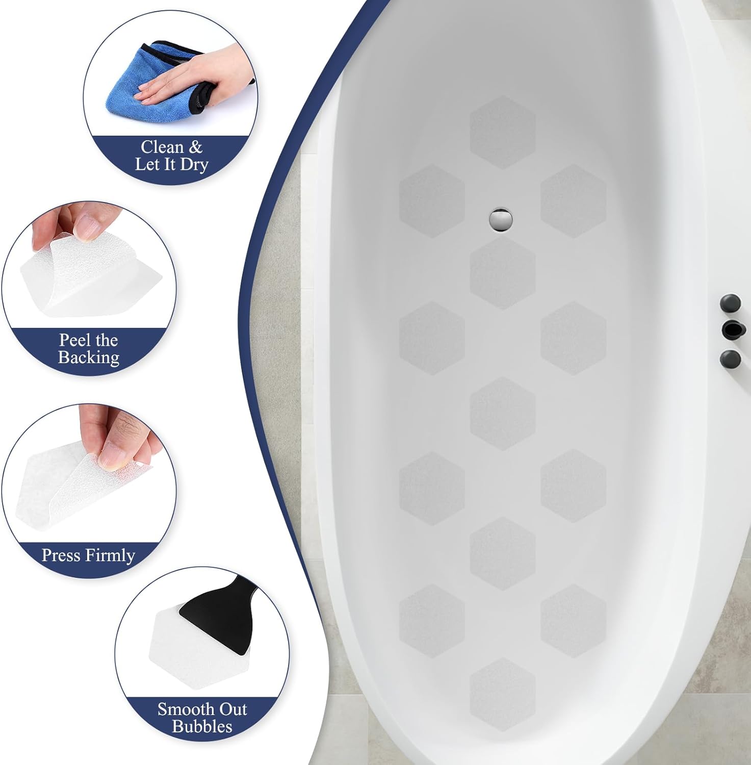 28 PCS Shower Floor Non Slip Stickers with Strong Adhesive, Invisible & Durable Anti Slip Shower Stickers with Scraper for Bath Tub, Pools and Stairs(Clear,Hexagon)
