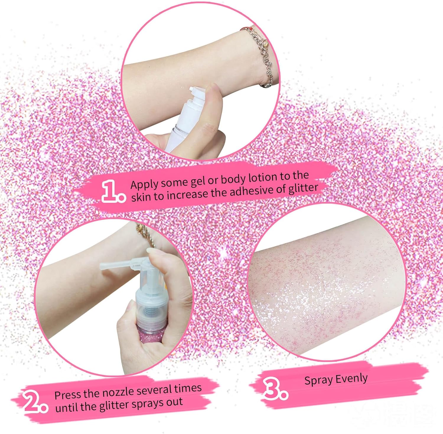 - Vibrant Sparkle:Shine bright with our body glitter spray!This spray body glitter is made with super glittery powder.Whether you're attending parties,or festive gatherings,this vibrant glitter spray adds the perfect touch of sparkle to your look,making you stand out in the crowd.This is glitter dry powder spray.Before use,apply some gel or body lotion to the skin to increase the adhesive of glitter.