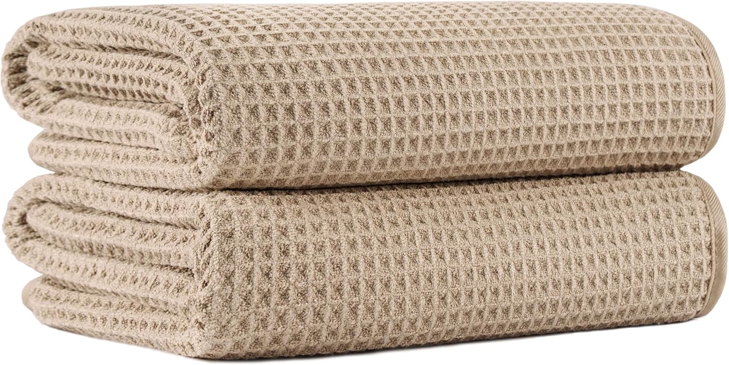 New Microfiber Waffle Bath Towels, 2 Pieces, Oversized, Soft, Absorbent, Fast Drying, Lint Free (Beige)