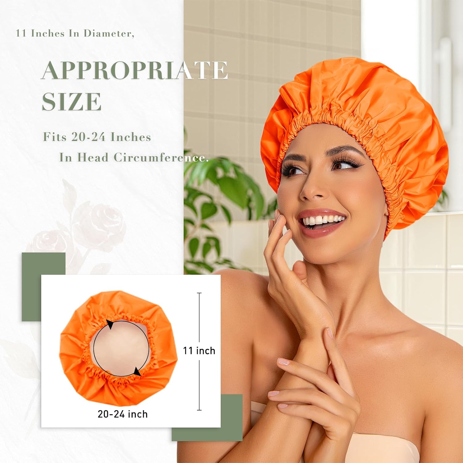 Reusable Shower Cap for Women, Large Waterproof Shower Essentials Bonnet Washable Elastic Band Bath Hair Wrap Hat for Long Hair, Braids(Orange)