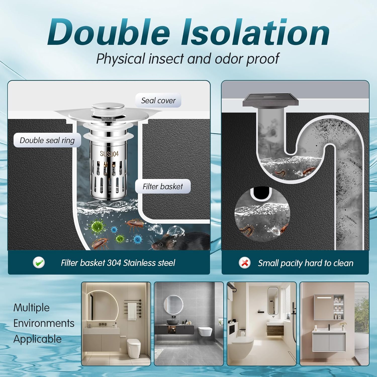 - 2-IN-1 Function: Innovatively combining drainage plugs and anti clogging filter baskets. Switch between storage/drainage with one press. Large basket catches hair/debris without slowing drainage. Outperforms traditional drains with better clog resistance and less cleaning needed.