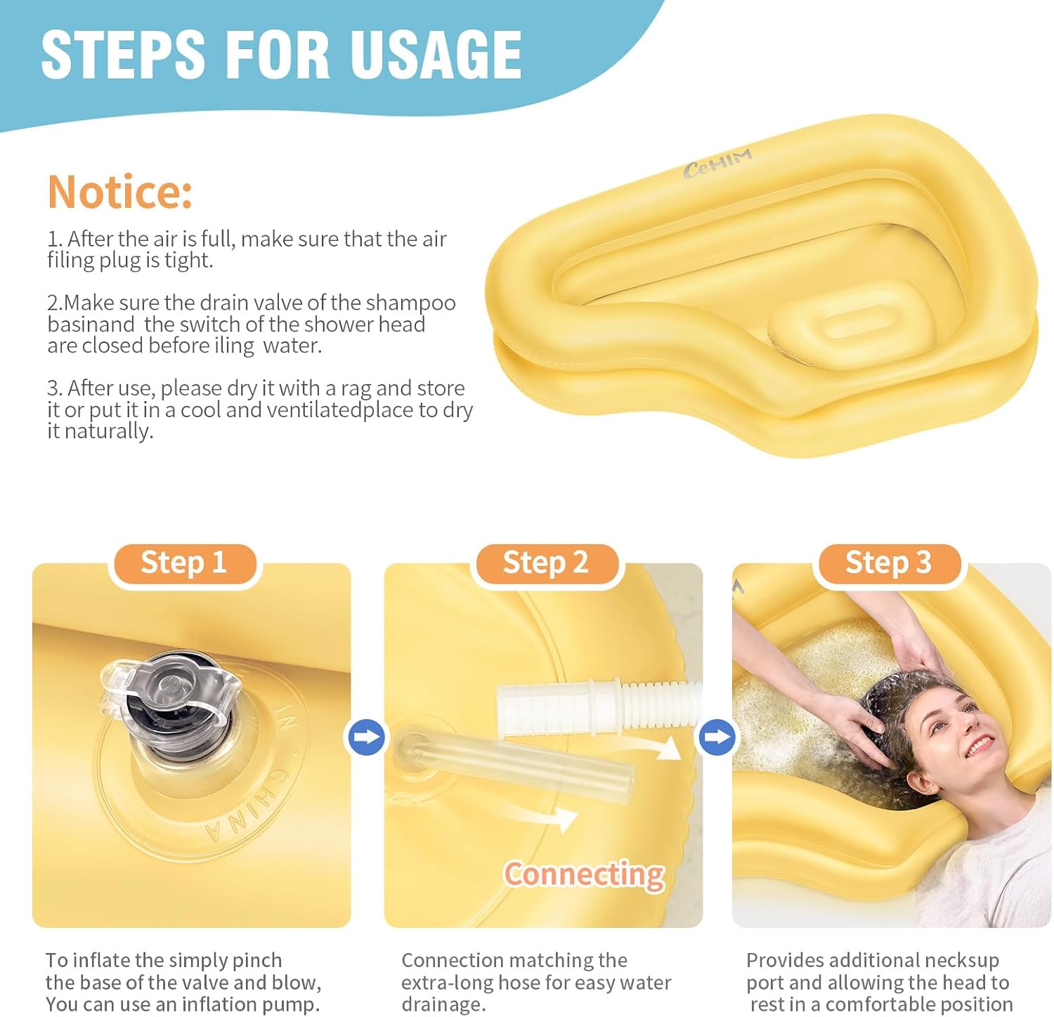- 【Zero Water Accumulation】 CEHIM large inflatable wash basin (32.8 x 22 x 7.08 inches) features an upgraded Angled Design Ensures Complete Drainage, ergonomic neck support, and built-in pillow for superior comfort while washing hair at bedside for elderly, children, and post-surgery patients. Perfect for home/salon use!