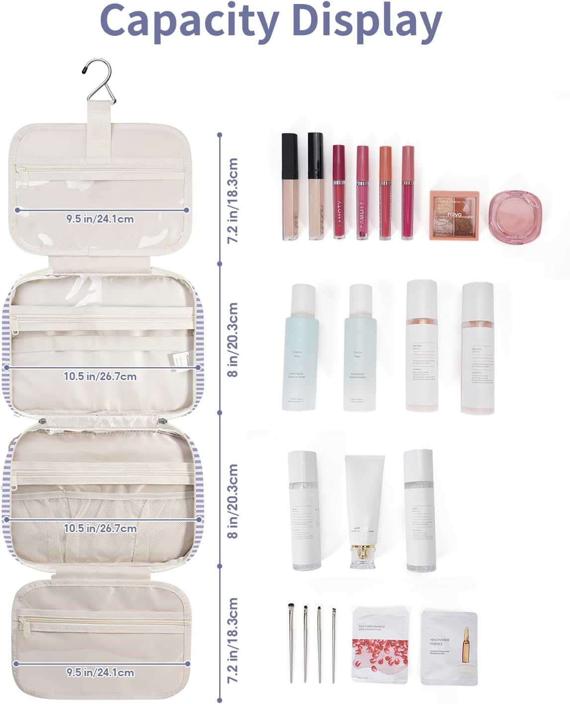 - PLENTY of ROOM - Fold size 10.75x8x5.5 inch, easily fit travel-size toiletries as well as makeup like shampoo, conditioner, lotion, toothpaste, toothbrushes, hair brush, shaving kit and a few extra items