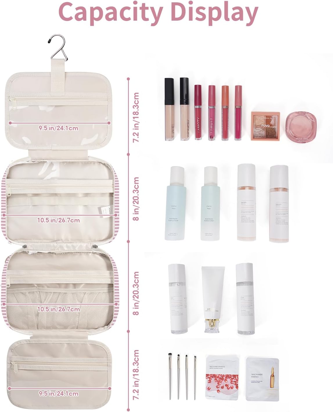 Narwey Striped Hanging Toiletry Bag for Women Travel Makeup Bag Organizer Toiletries Bag for Travel Size Essentials Accessories Cosmetics (Dusty Pink Stripe (Medium))