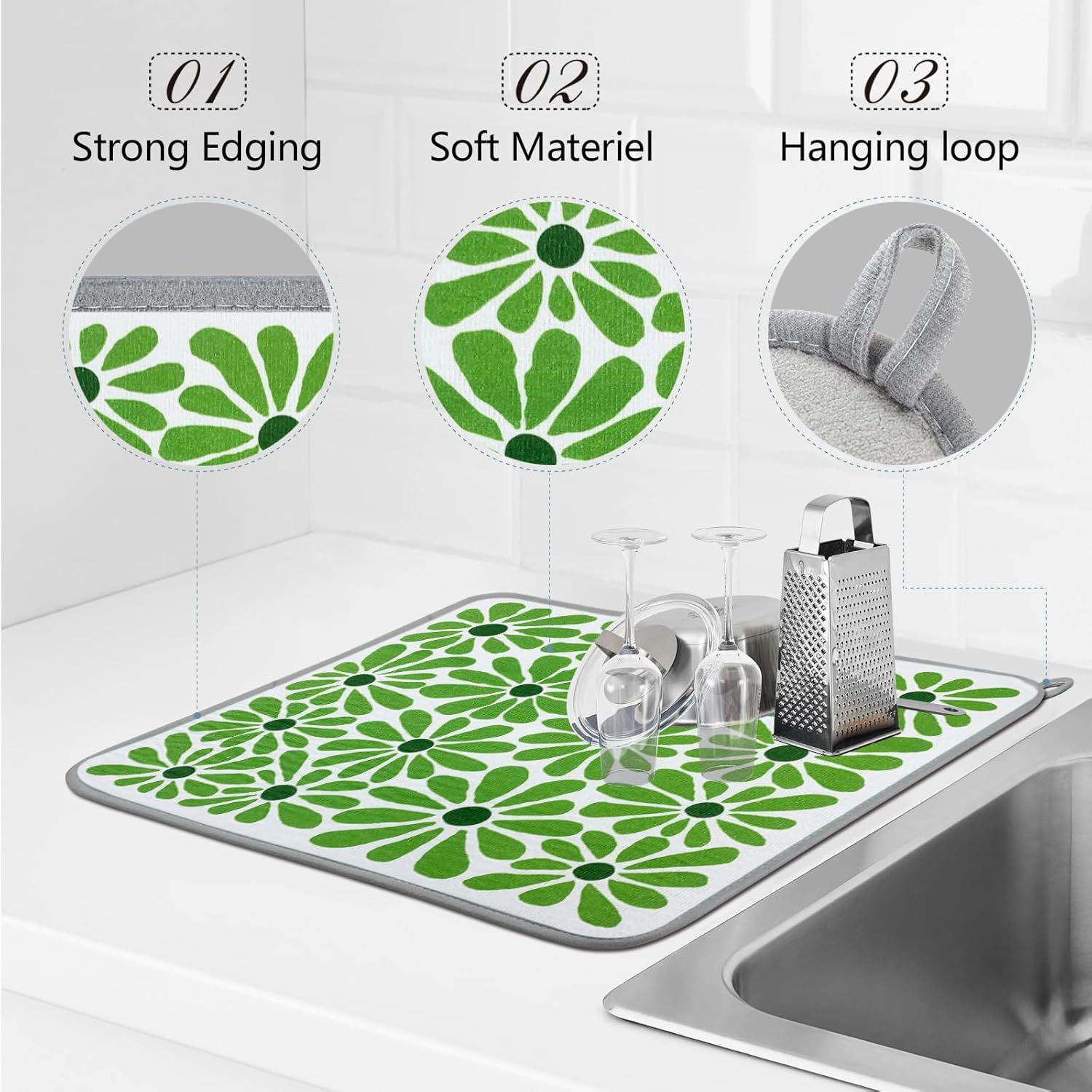 - ๐ DURABLE: This drying mat for kitchen counter wonโt fade , pill deform or be smelly after long time use compared with the cloth drying pad. Amazing water absorption and quick drying make it difficult for harmful and pathogenic substances to breed