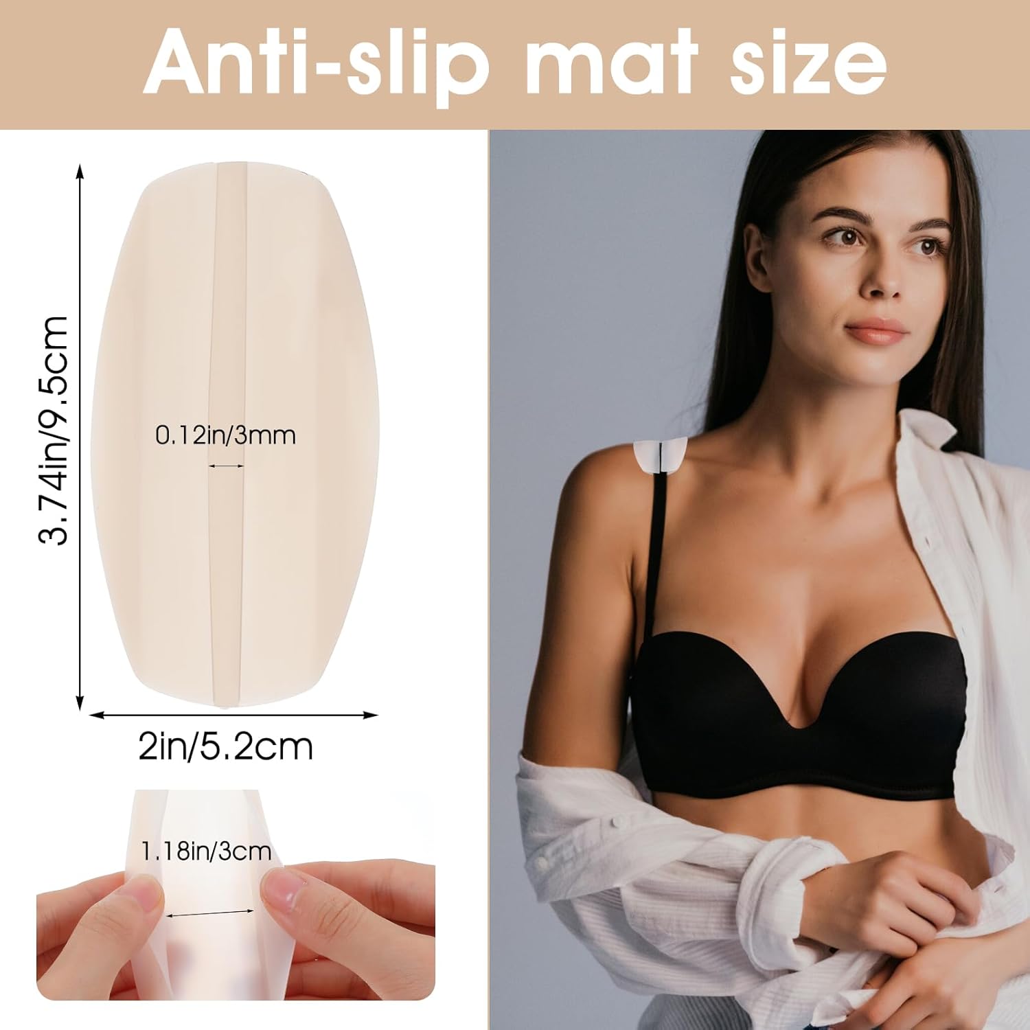 - These non-slip bra keepers offer a blend of silicone comfort and carbon steel security. With 3.74×1.97" pads and 9.45" straps in three shades, they prevent strap slippage. The anti-slip bra accessories 66g package includes 6 pieces (2 complete sets per color) in a 5.91×3.94×0.75" bag.