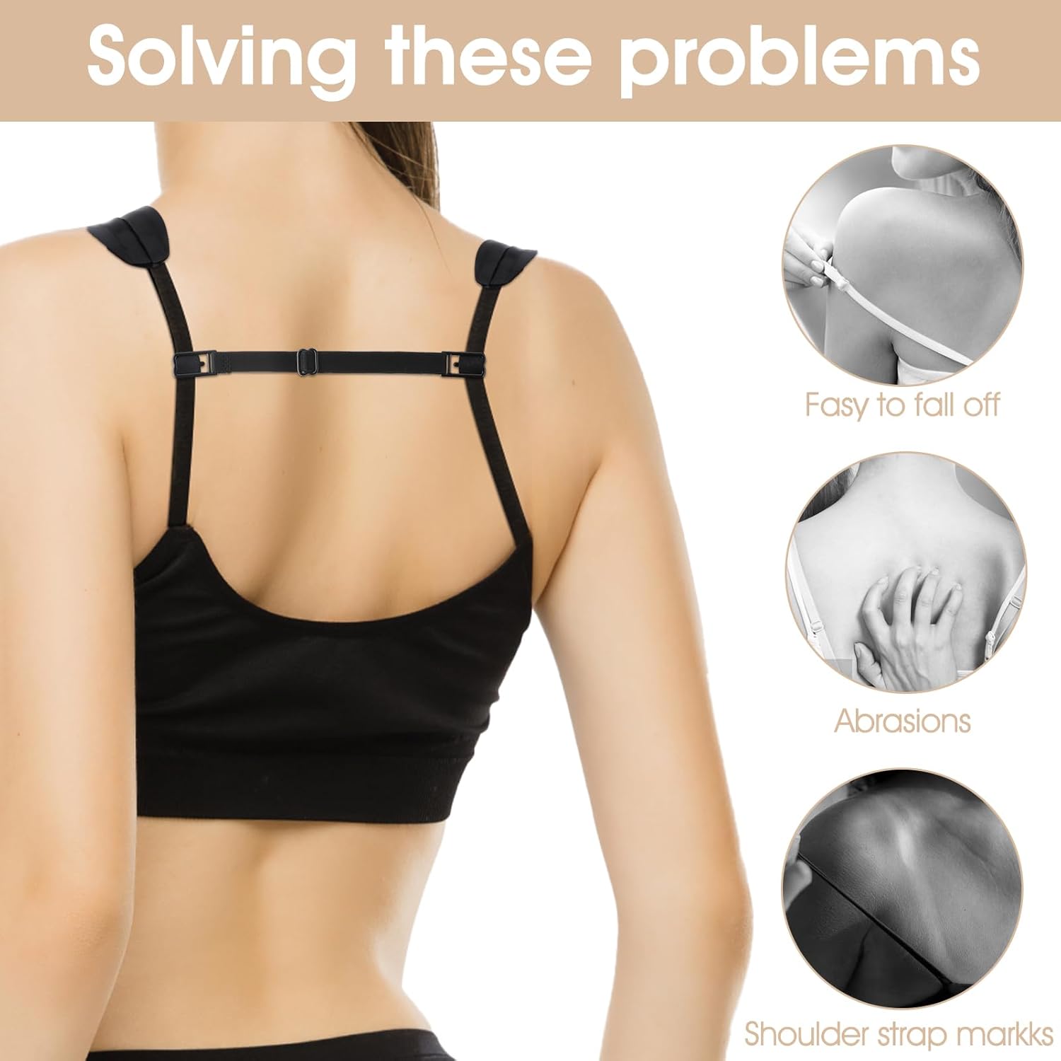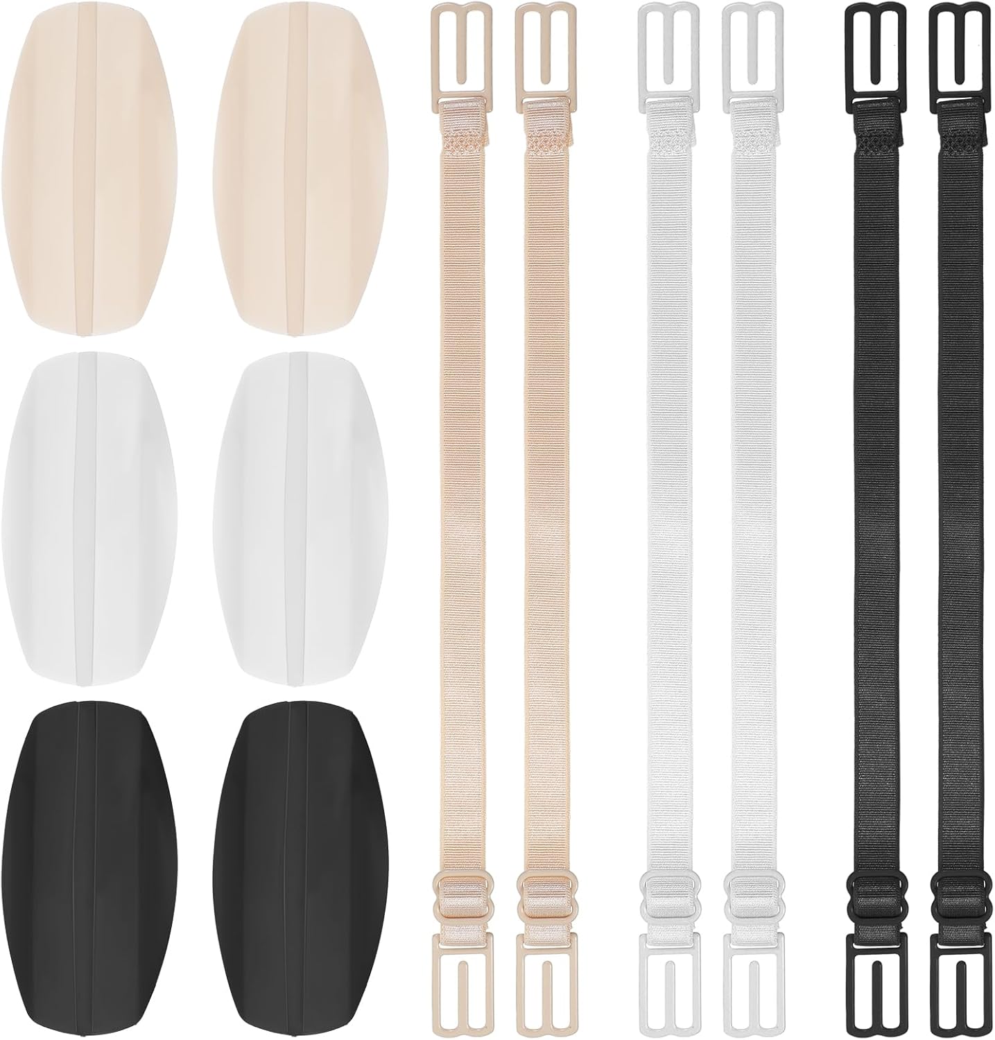 - This bra strap holders for slipping comes in black, nude, and white, made from silicone, polyester, and carbon steel for secure grip. The bra strap cushion (9.5×5cm) and adjustable straps (24×1cm) prevent shoulder straps from slipping. Packaged in a 15×10×1.9cm bag, it includes 2 pads and 2 straps per color (6 total pieces), weighing 66g.