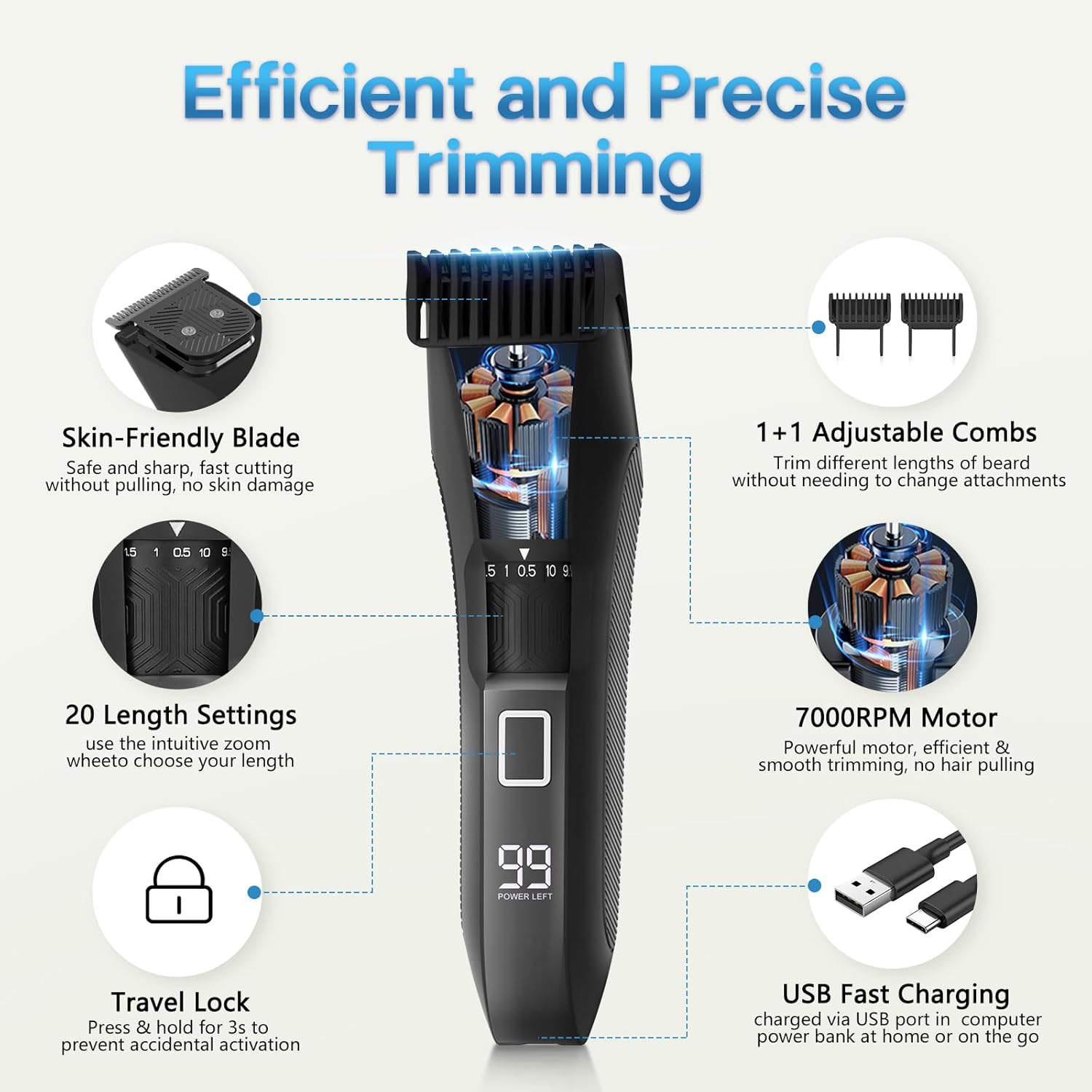 Beard Trimmer for Men, 20 Length Adjustable, Cordless Waterproof Clippers, Stainless Steel T-Blade for Precision Facial Hair Trimming with 2 Guide Combs, Travel Lock, LED Display