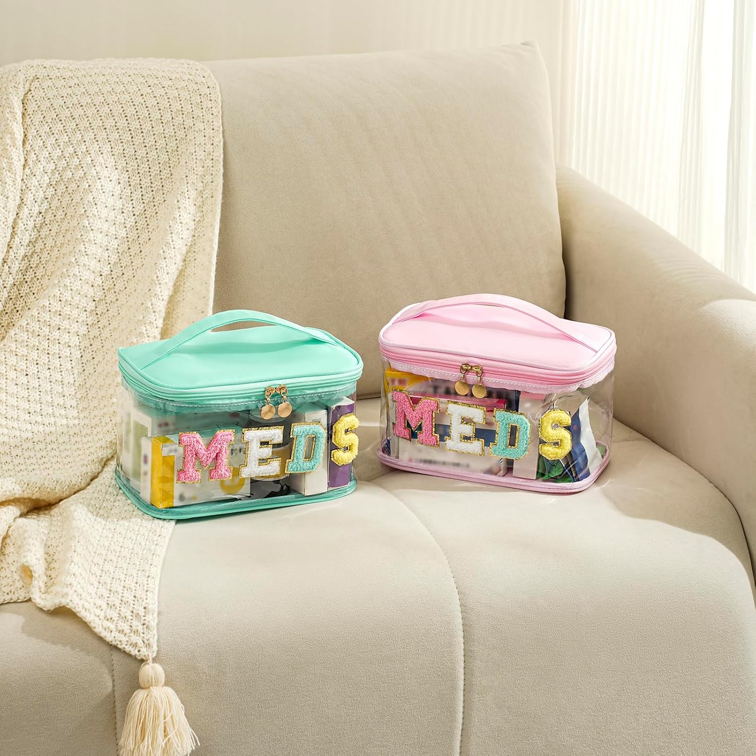 Personalized Chenille Letter Clear Medicine Makeup Bag, Large Waterproof Nylon Cosmetic Toiletry Storage bag with Top Handle, Transparent Meds First Aid Travel Organizer Cosmetic Bag(12Green-Meds)