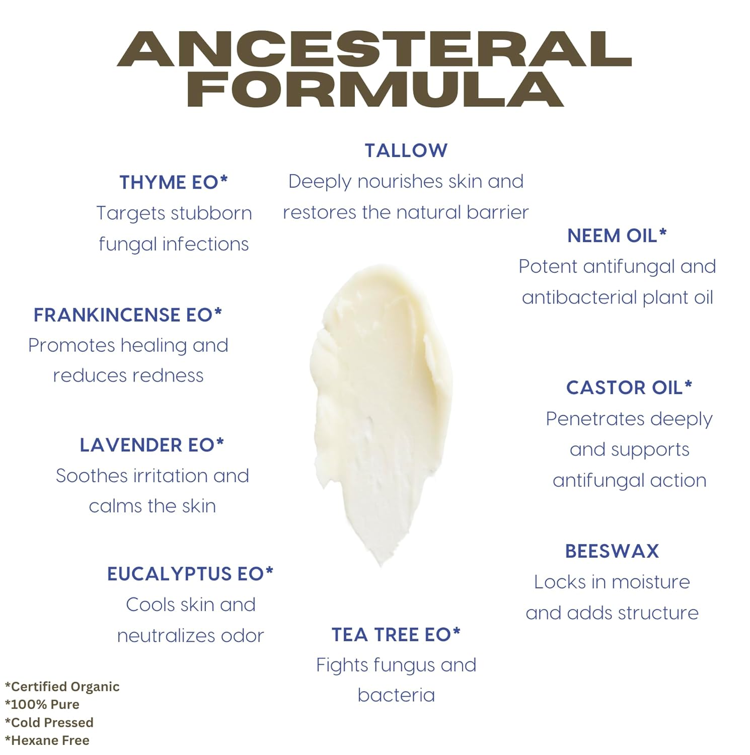 - TARGETED FUNGAL RELIEF: Formulated with grass-fed tallow, organic neem oil, organic castor oil, raw beeswax, and a powerful blend of organic antifungal essential oils including tea tree, thyme, and frankincense.