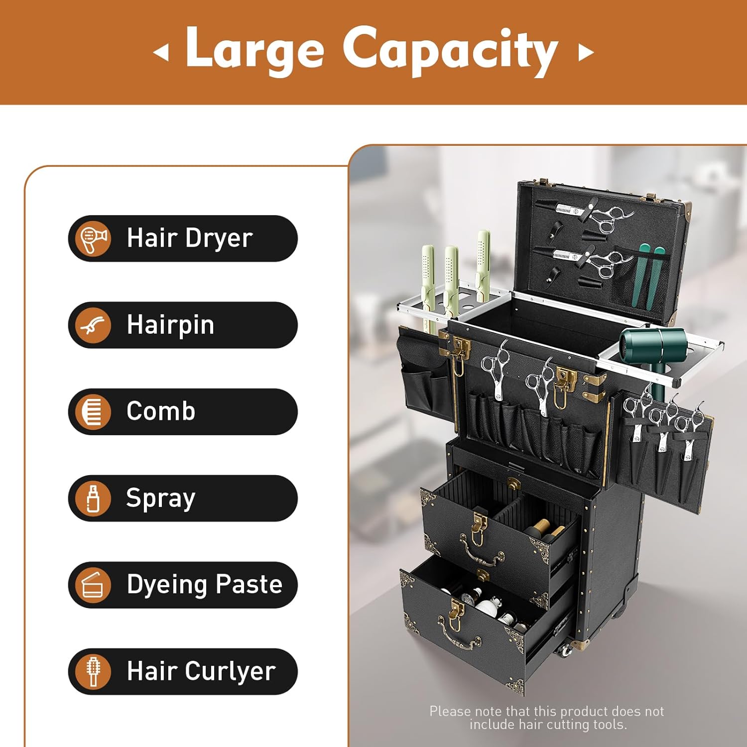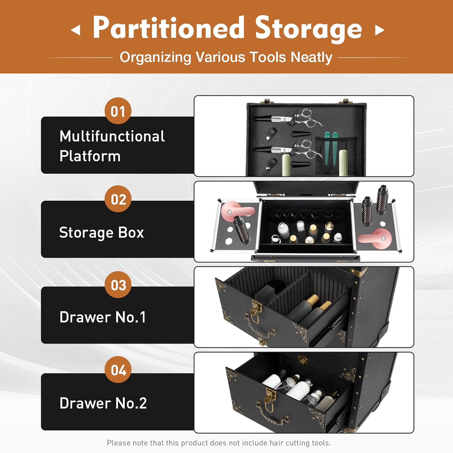 - CONVENIENT STORAGE:Multi-layer large capacity inside the trolley case, each layer is built for storing different tools. You can use it to store your cosmetics, hair dryer, barber tools, etc. to keep your tools more organized.