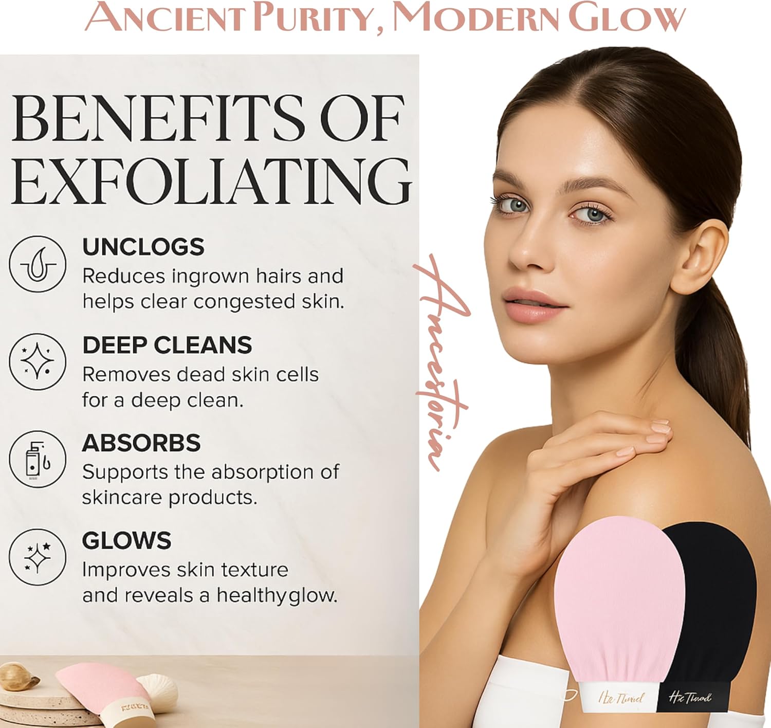 Ancestoria Korean Exfoliating Gloves for Shower, Pink and Black, 2-Pack, Deep Exfoliating Mitts for Body, Reusable and Chemical-Free, A HerTime2 Brand