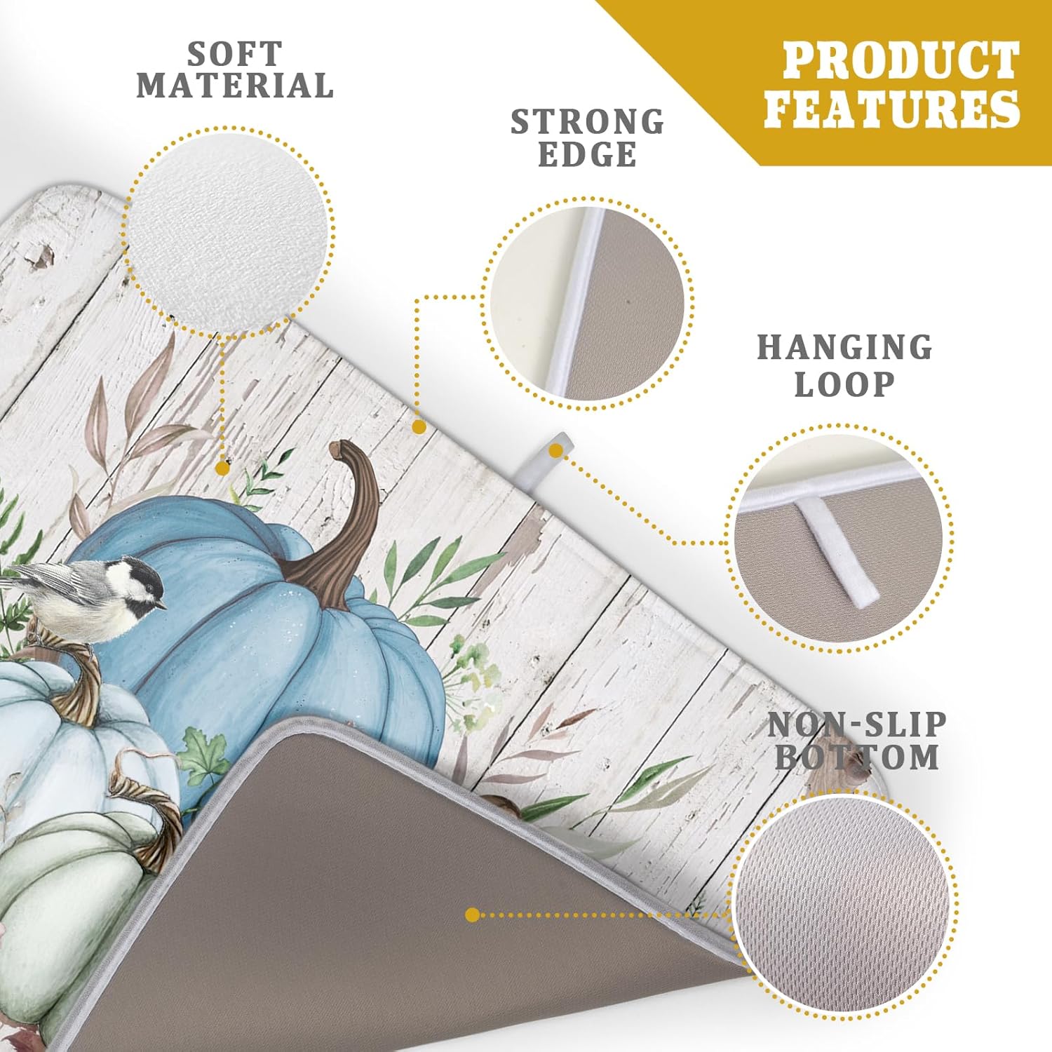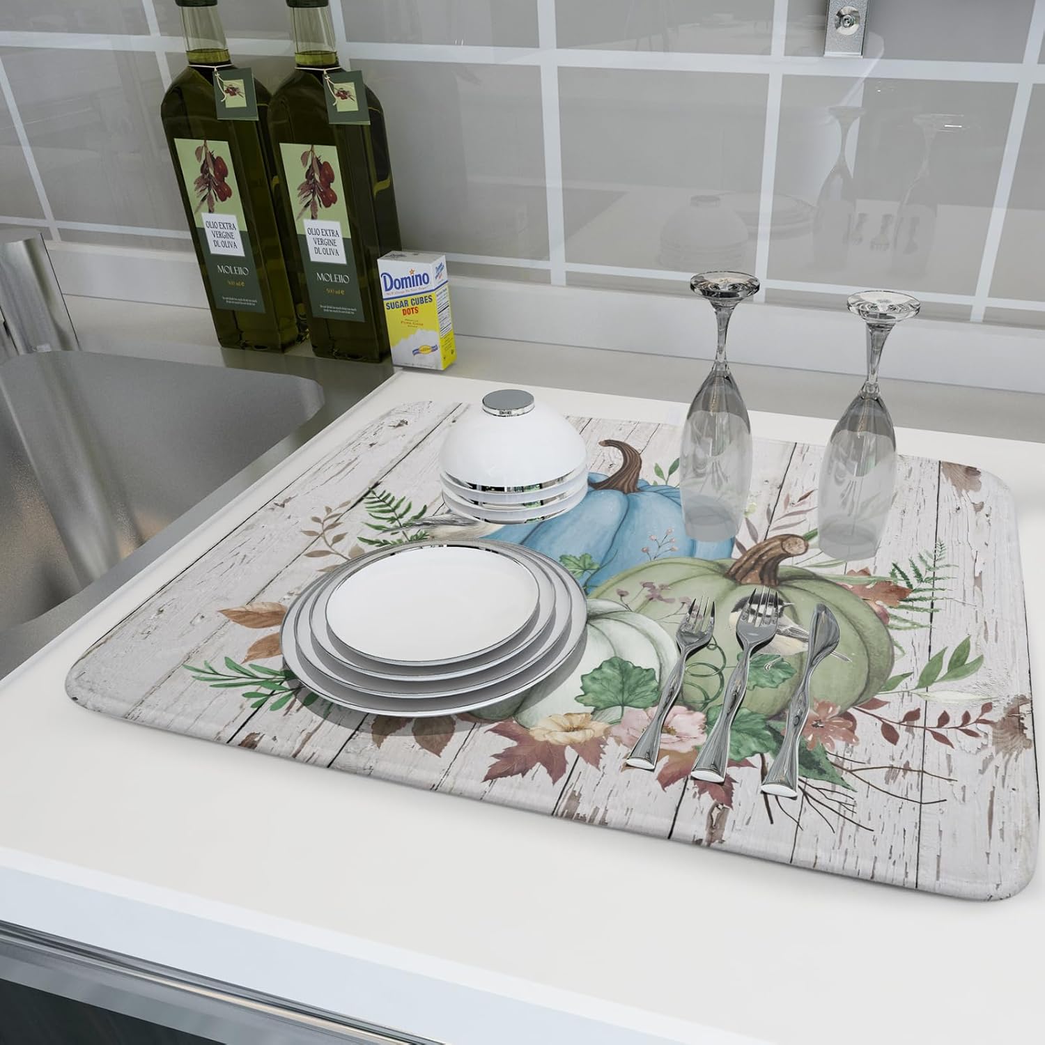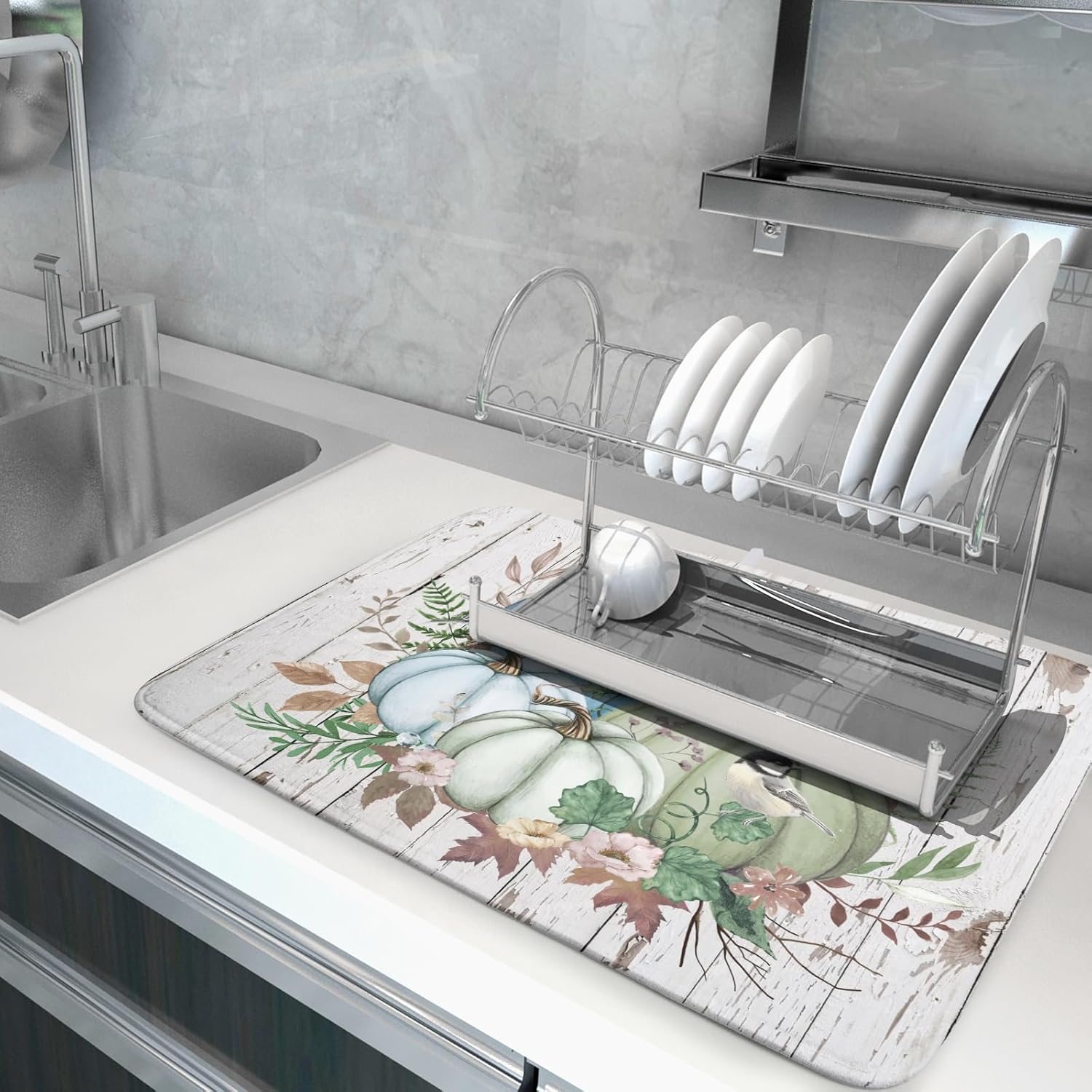 - 【Protect Tableware】Place your dishes on it or under dish racks, the autumn pumpkin dish mat prevents bowls, glassware, and more tablewares from being scratched or worn, can be used as dish drying mat, sink mat, dishes drainer mats to keep the countertop dry and tidy.