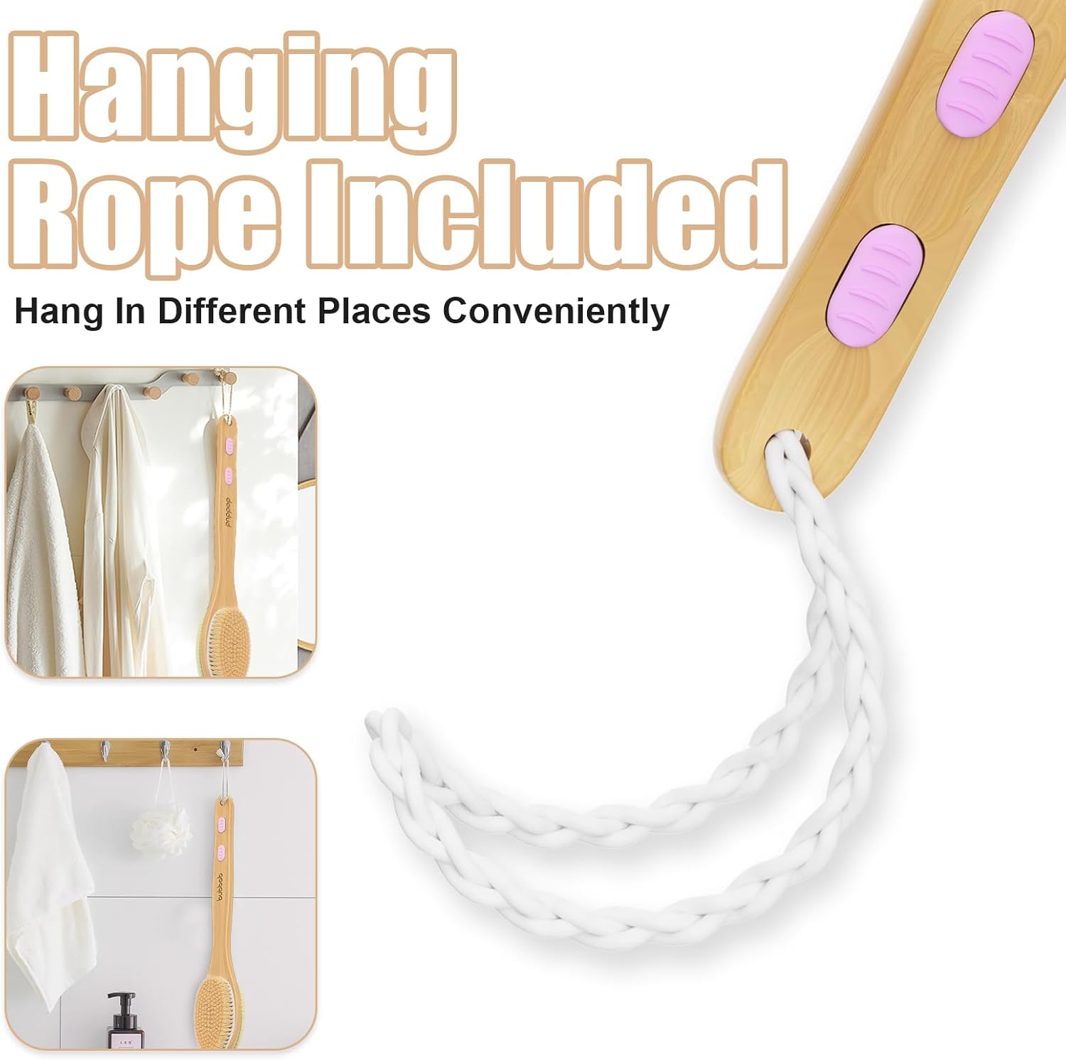 - Anti-slip grips(back scrubber): There is a non-slip rubber patch and a hanging rope at the handle for your comfort and ease of mind while brushing