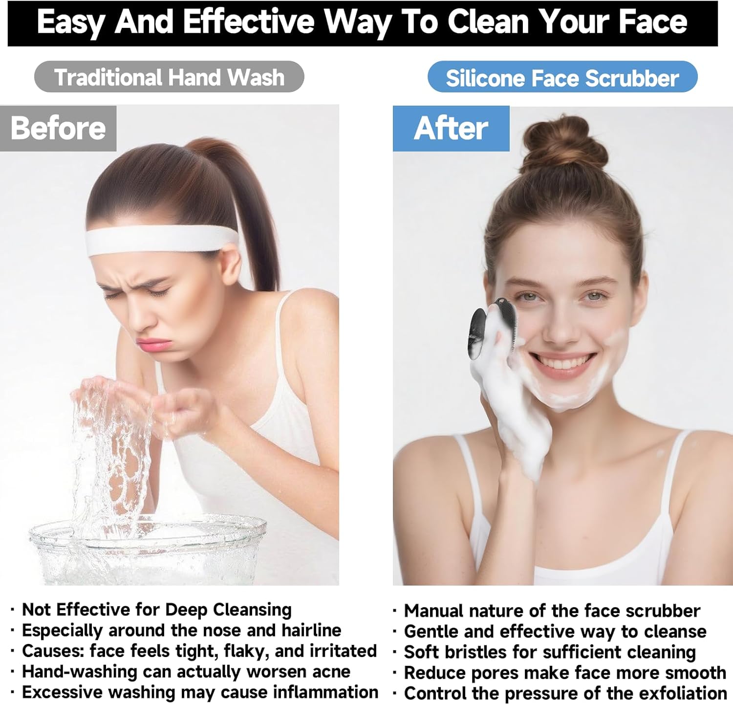- BENEFIT: Why Do We Use Silicone face exfoliator scrubber? Because silicone materials stay clean and are simple to rinse off. They have no odd smell, dry quickly, are recyclable, and help you achieve a deep clean. Silicone is much more hygienic than tradition hand wash