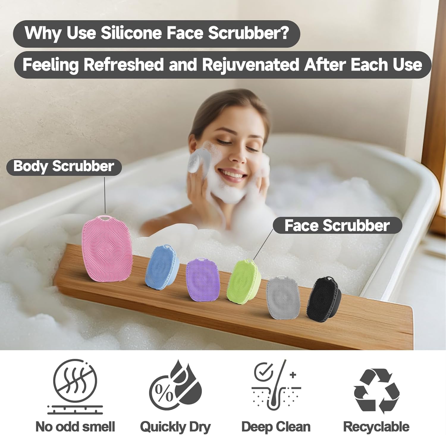 - BENEFIT: Why Do We Use Silicone face exfoliator scrubber? Because silicone materials stay clean and are simple to rinse off. They have no odd smell, dry quickly, are recyclable, and help you achieve a deep clean. Silicone is much more hygienic than tradition hand wash