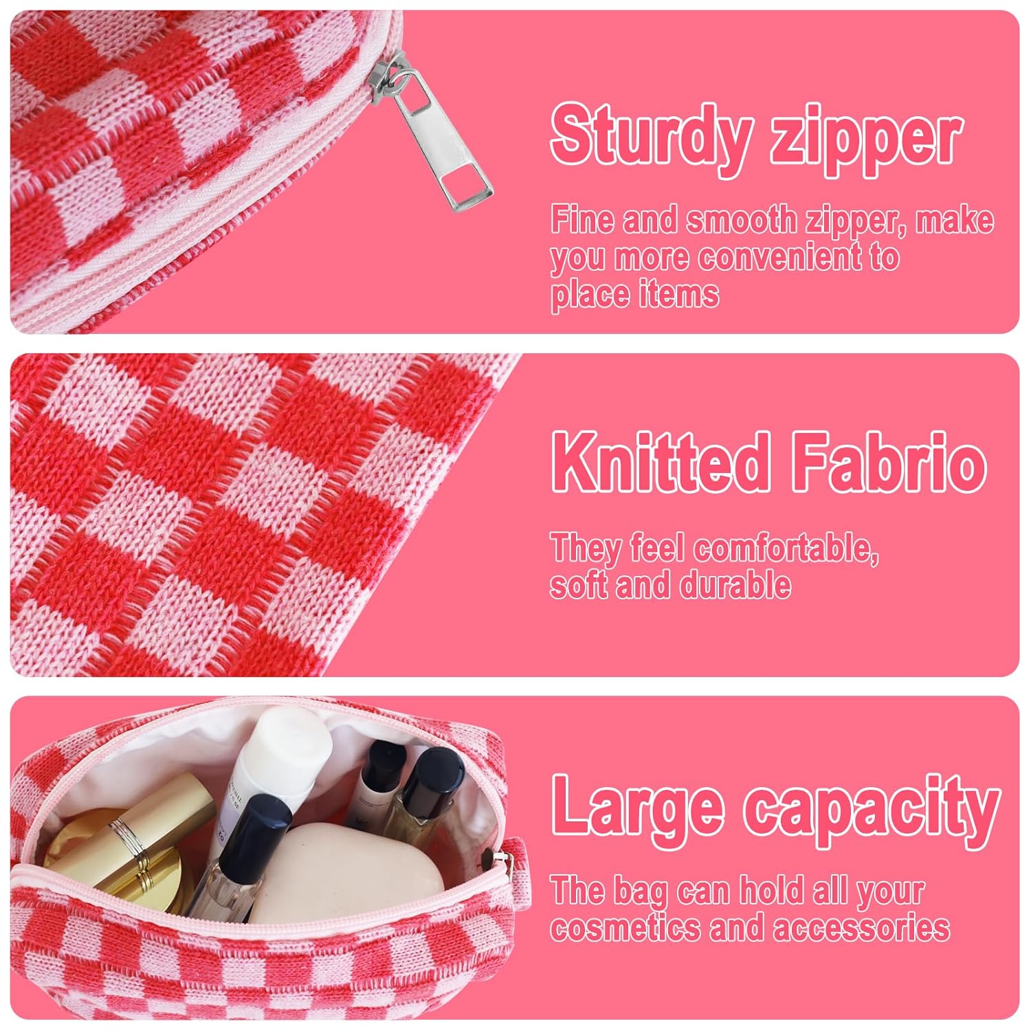 - LARGE CAPACITY AND PREMIUM MATERIAL: The cute makeup bag measure 7.1Γ4.3 inches, easy to carry. The checkered makeup bag is made of soft knitted fabric, easy to clean. The smaller ones can be used as pencil case or pencil pouch.This makeup travel bag can also hold small items such as makeup, skincare products, lipstick, eye shadow, eyebrow brush, etc. Makeup storage bag for women toiletries