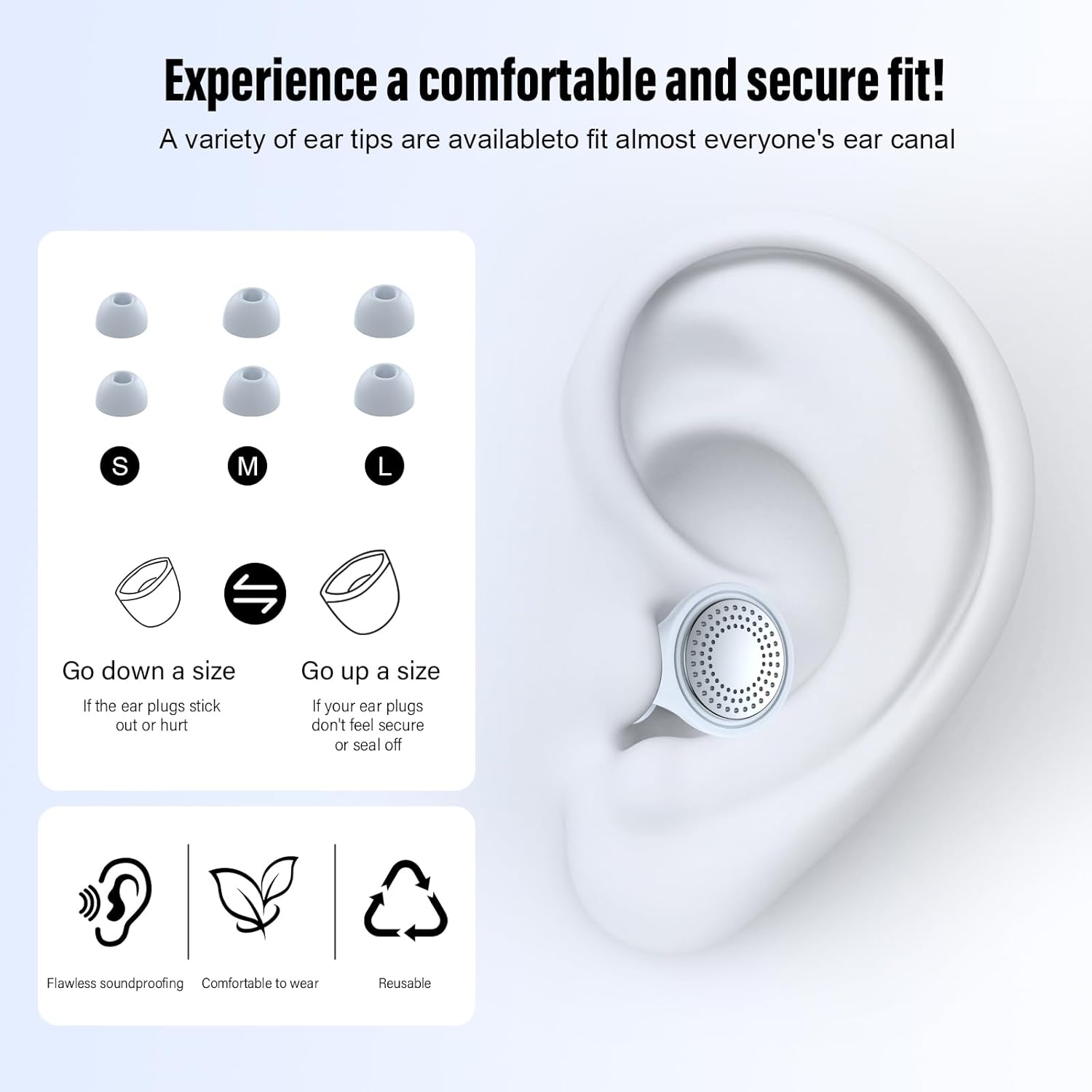 - Two Comfort Options for Personalized Fit: Earplugs for sleep choose between slow-expanding memory foam for a custom noise-blocking seal or hypoallergenic silicone tips in three sizes (S/M/L). Both options stay securely in place all night without pressure or discomfort, perfect for side sleepers and active users.