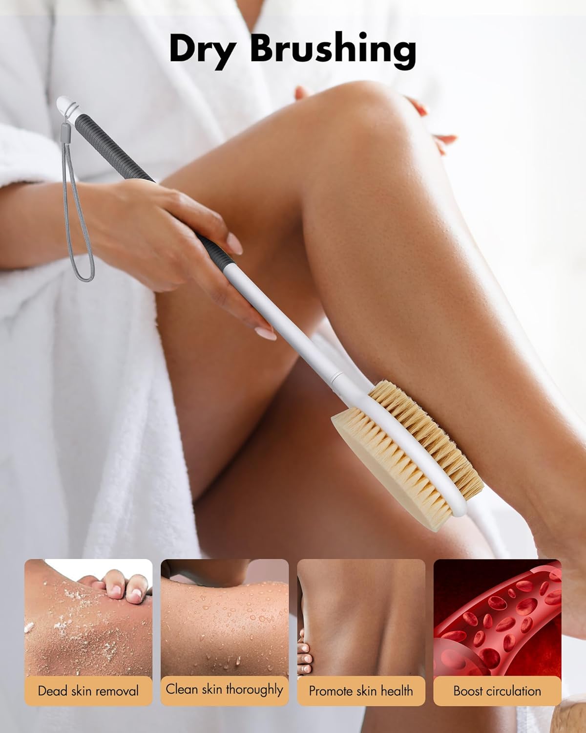 - 18.1" Extra-long Handle Sufficient to Reach Lower Back: This Body Brush handle is longer than a normal brush, covers 10% more back area than similar products. Effortlessly covers your entire back, calves, feet and other hard-to-reach areas —no bending or straining required. Perfect for tall users or limited mobility!