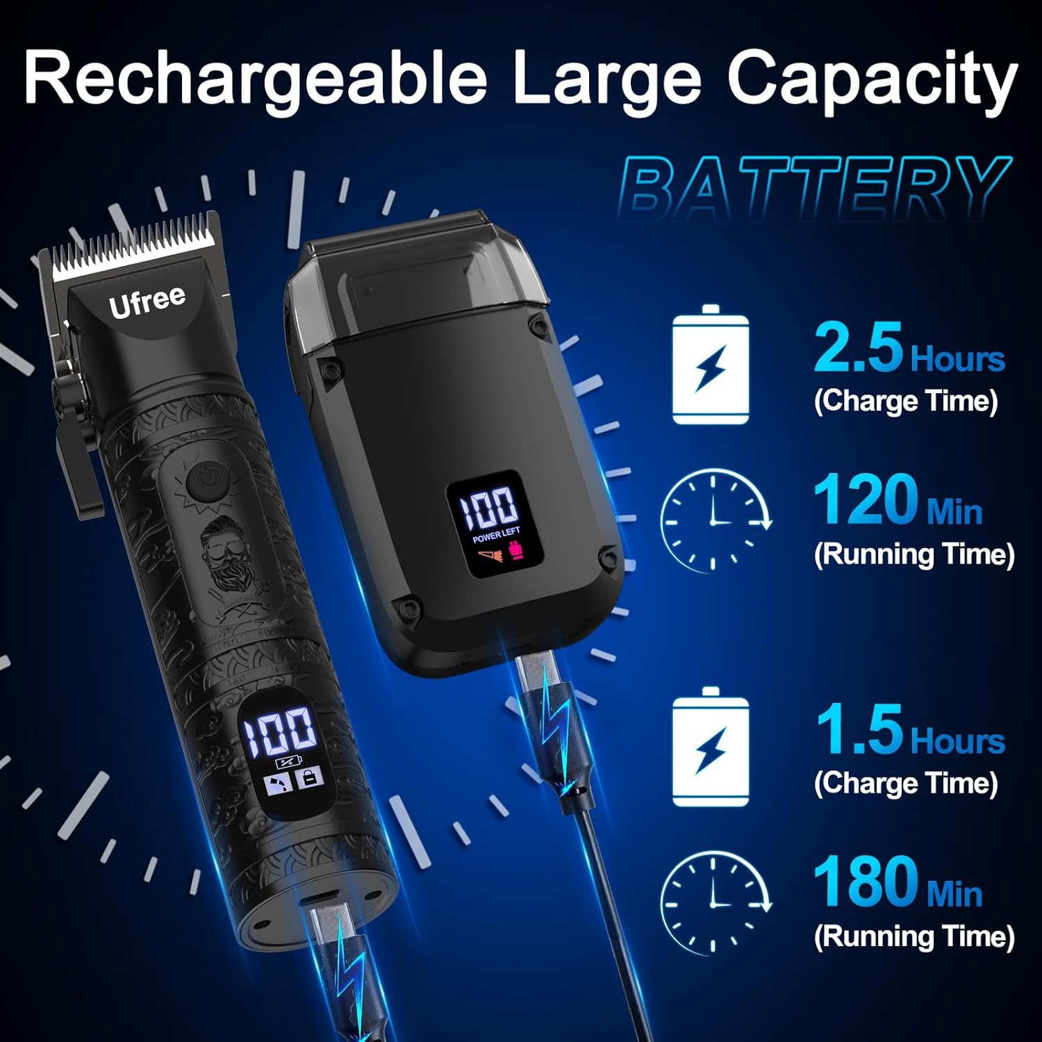- Long Battery Life Time: Menโs hair clippers have a built-in lithium-ion rechargeable battery, factory through layers of strict screening tests. you can operate wirelessly for up to 180 minutes after 1.5 hours of charging; The rechargeable razors for men can be used for up to 120 minutes after 2.5 hours of charging, suitable for traveling or business trips. Comes with 2 universal Type-C data cables that can be used interchangeably, no need to organize messy data cables.
