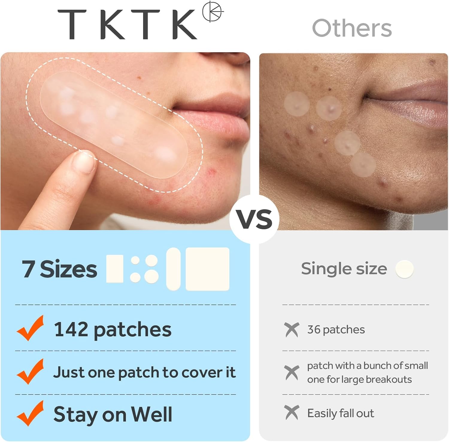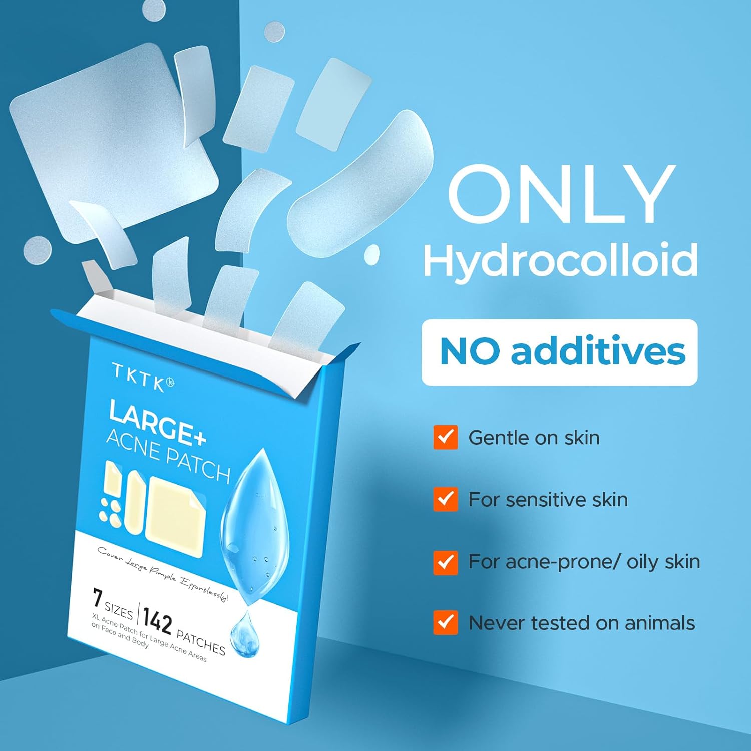 - 7 Sizes, 142 Patches for Every Need: TKTK large pimple patches come in 7 sizes (31x18mm, 60x20mm, 60x60mm, 8mm, 10mm, 12mm, 14mm), designed to target acne on various areas like your face, back, chest, chin or forehead. No matter the size or location, our hydrocolloid patches effectively fit and provide the coverage you need