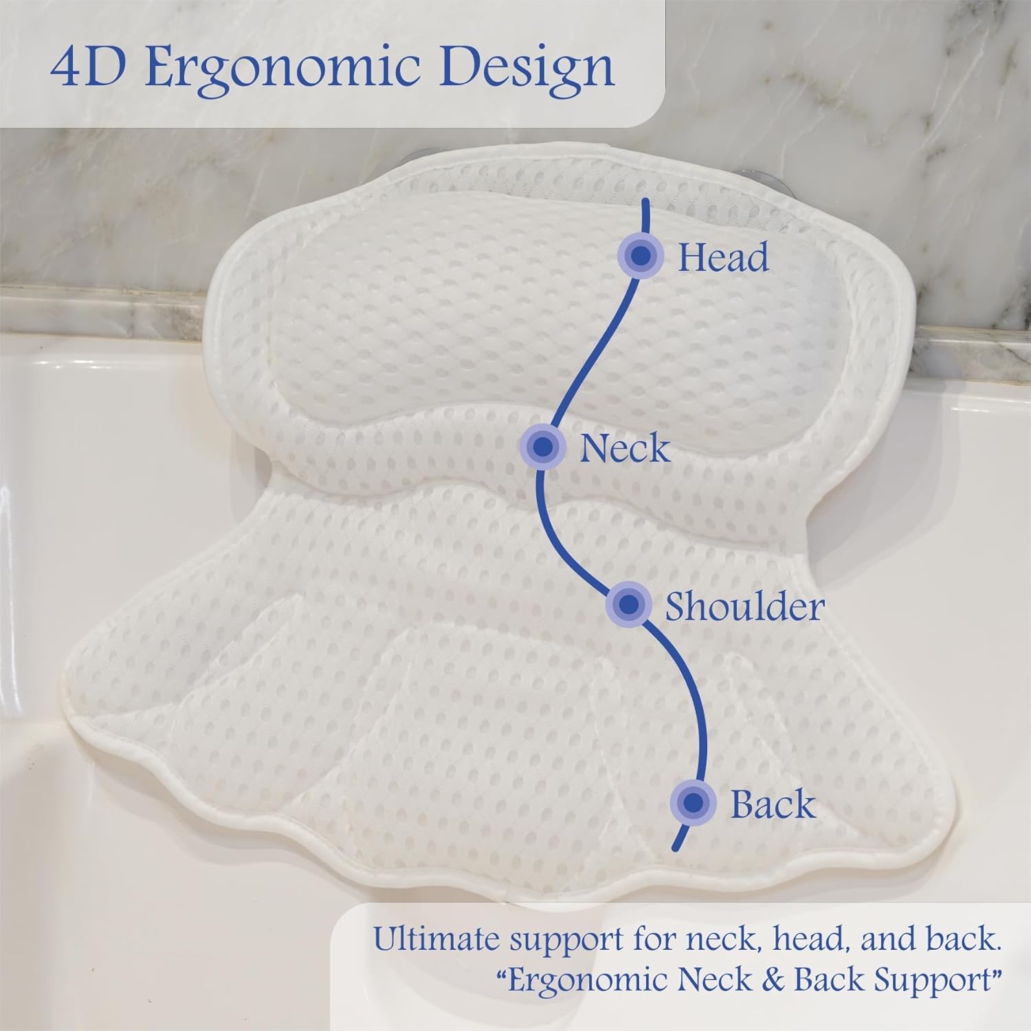- ✅ "Ergonomic Support for Neck, Head & Back" - The bath cushion’s contoured design offers soft, breathable support to relieve tension and elevate comfort during every soak. Ideal for deep tubs or long bathing sessions.The soft padding on its side and lower part is wide and long enough that it covers the lower back area, up to the neckIts head rest part has extra thick padding that cradles the noggin ever so nicely.