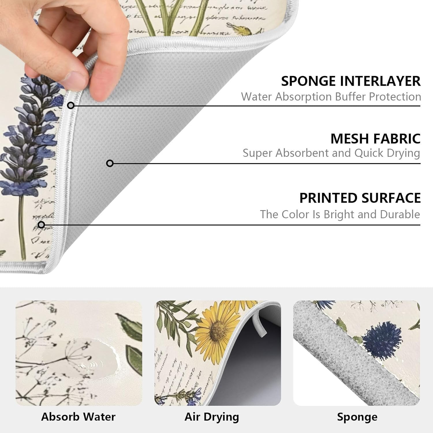 - ABSORBENT DISH DRYING MAT: 3-layer composite, Made of polyester microfiber (printing) & cushioning foam & cotton satin, durable and absorb dish water quickly, keep counter tops neat and clean.