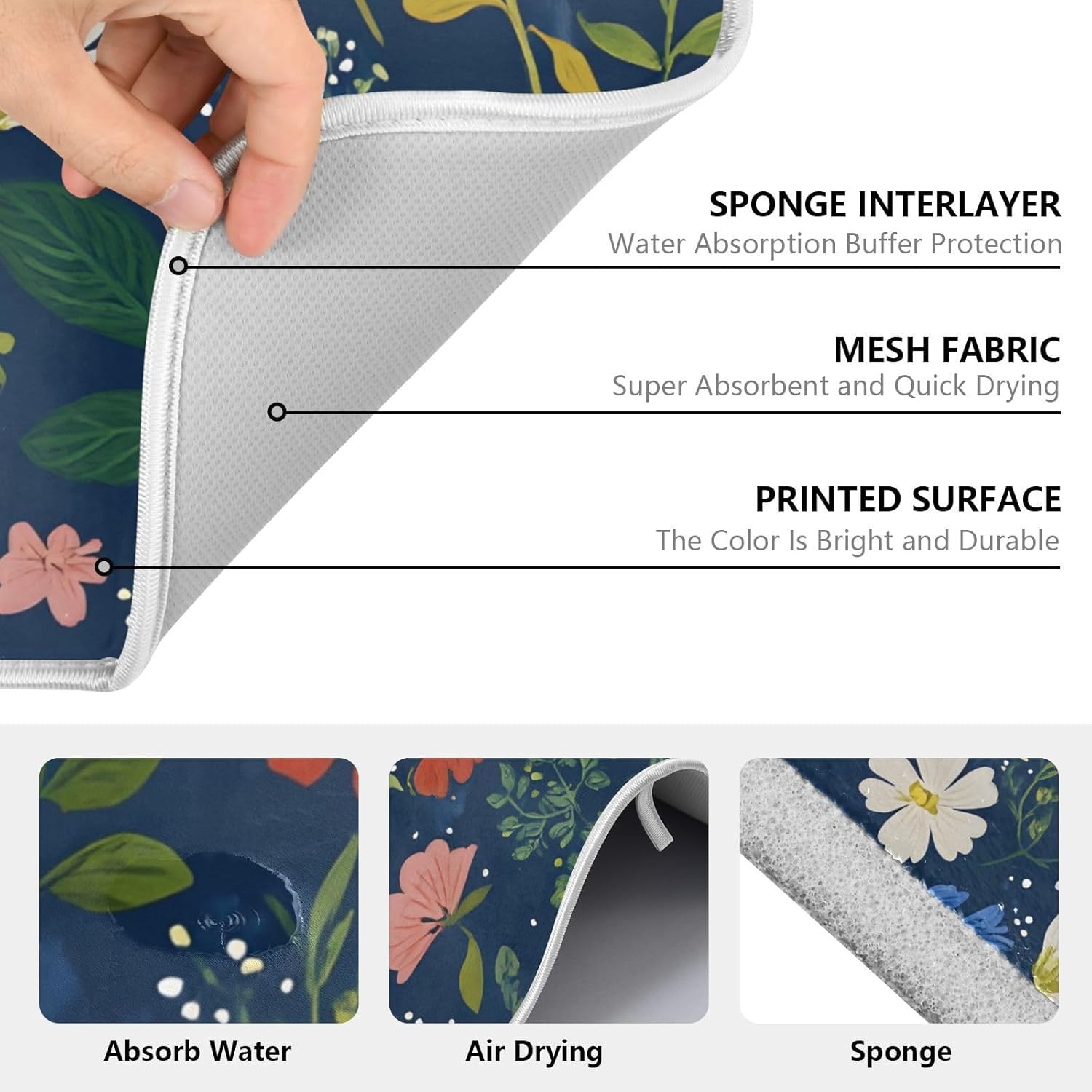 - ABSORBENT DISH DRYING MAT: 3-layer composite, Made of polyester microfiber (printing) & cushioning foam & cotton satin, durable and absorb dish water quickly, keep counter tops neat and clean.