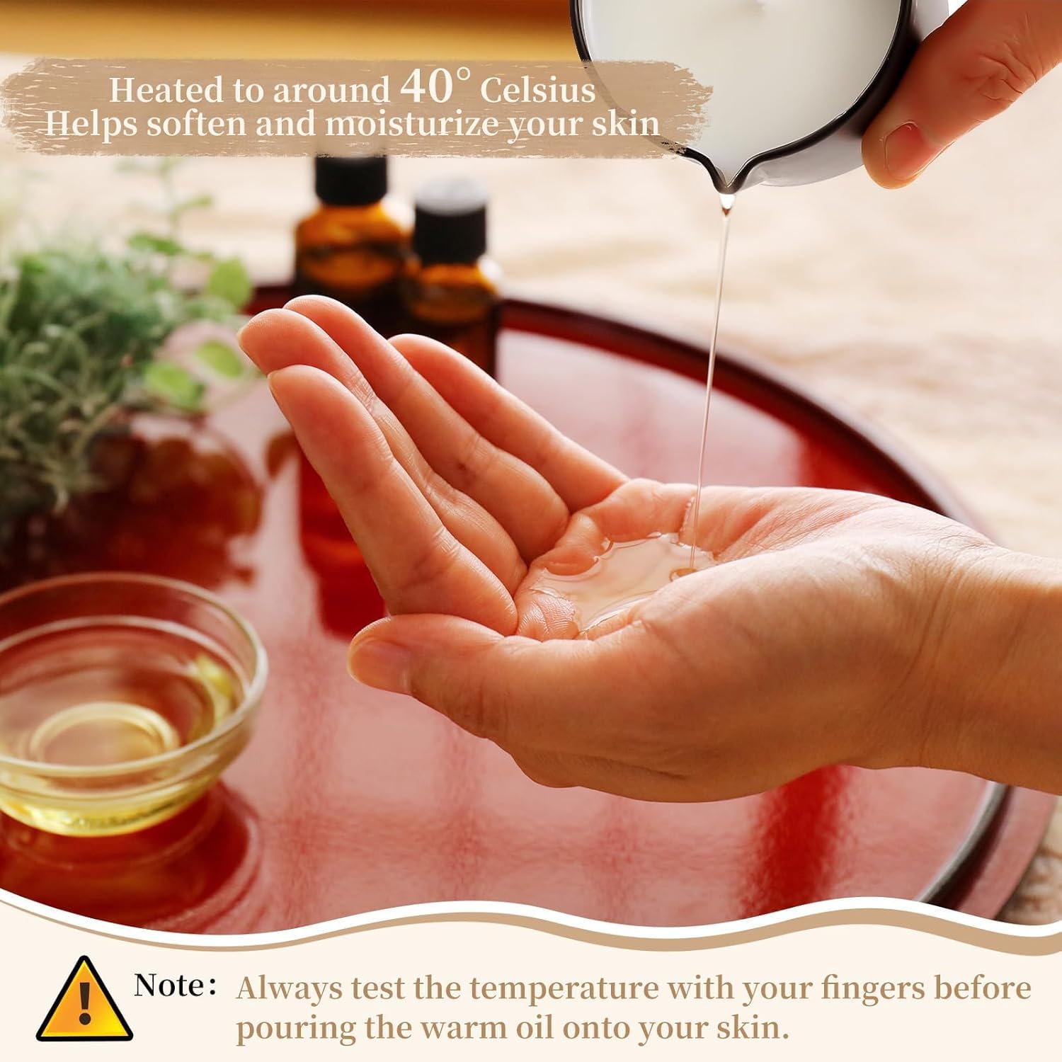 - Easy to use: Just light the massage candle for about 30 minutes to melt the wax into oil; Warm massage oil heated to about 40 degrees Celsius will help soften and moisturize your skin. Test the temperature with your fingers and then pour the warm oil onto your skin