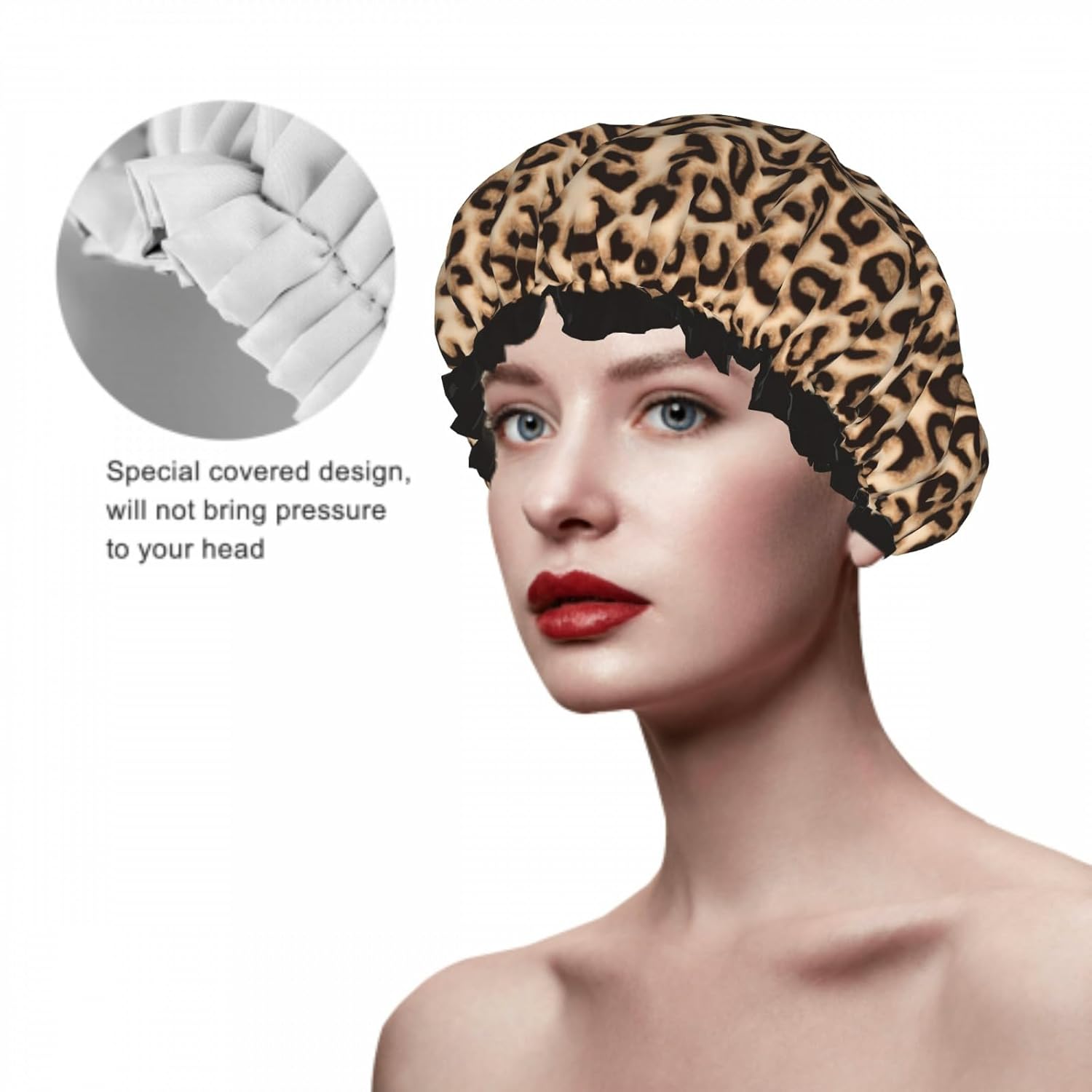 - Opulent Elegance :The leopard double-layer waterproof shower cap is made of lightweight and soft waterproof polyester outer layer and PEVA inner layer, the outer layer with fashionable embossing, it will add stylish style to your bathroom time.