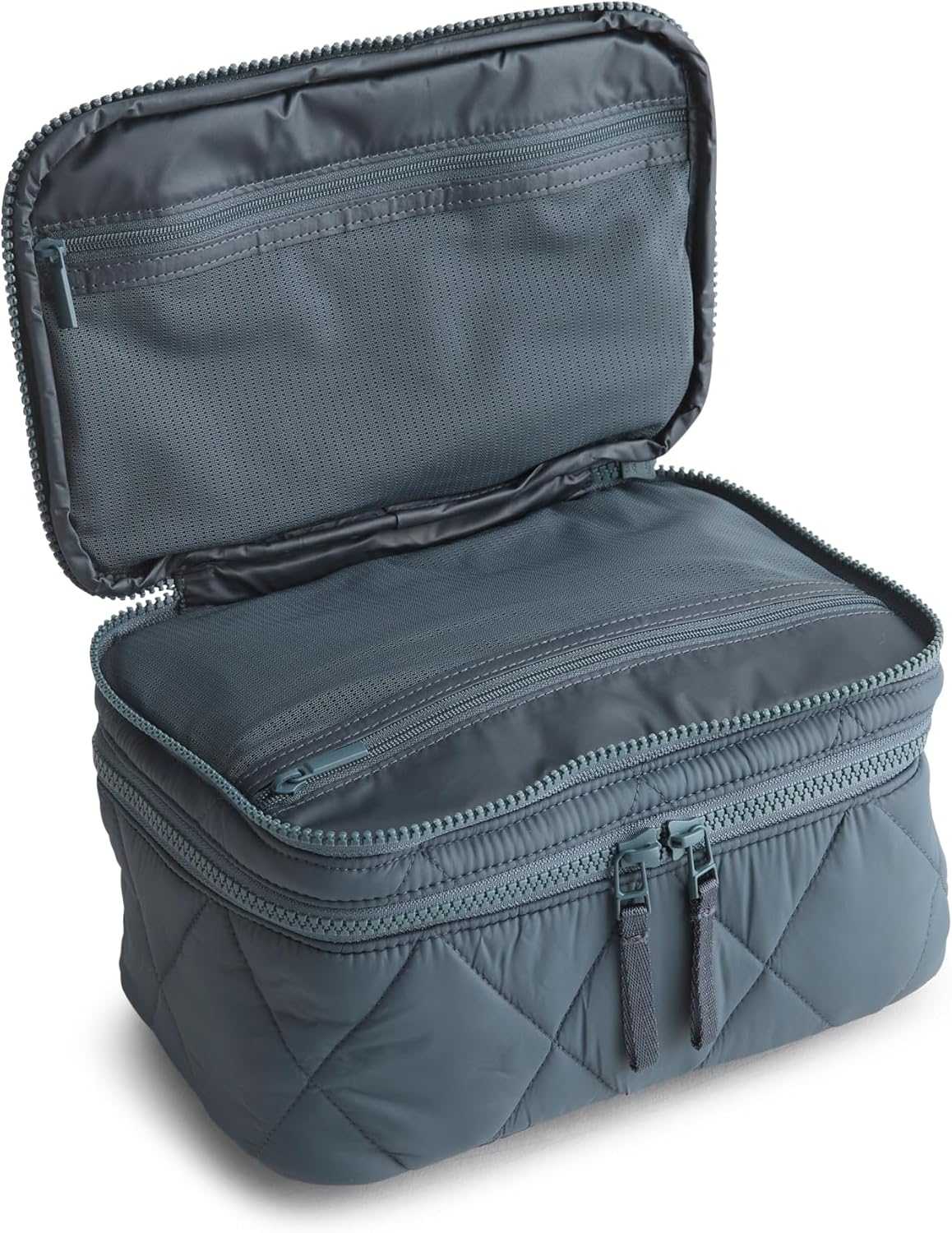 - DETAILS - Interior features two zip pockets, two slip pockets, and eight elastic makeup brush loops with a wipeable TPU cover