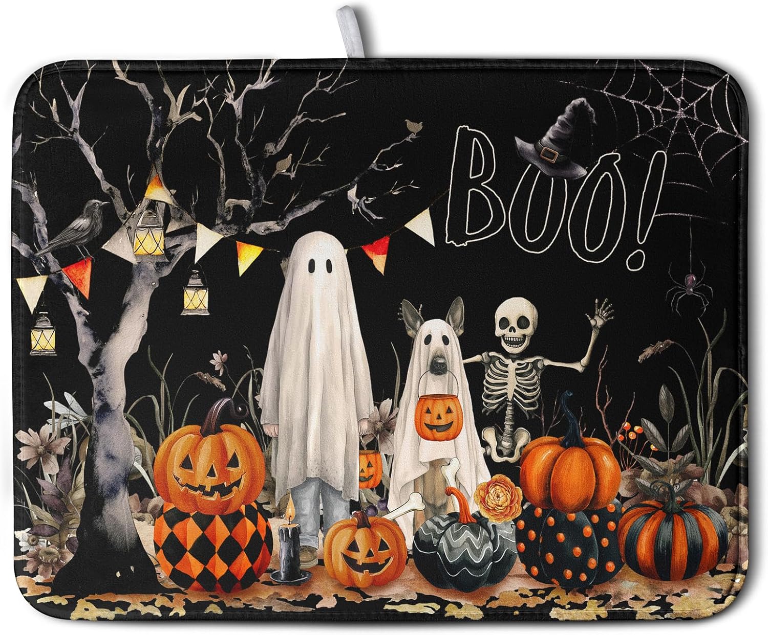 Halloween Dish Drying Mat for Kitchen Counter 18x24 Inch Black Ghost Pumpkins Dog Boo Skull Dishes Drainer Mats Absorbent Microfiber Washable Dish Draining Pad for Sink Coffee Bar