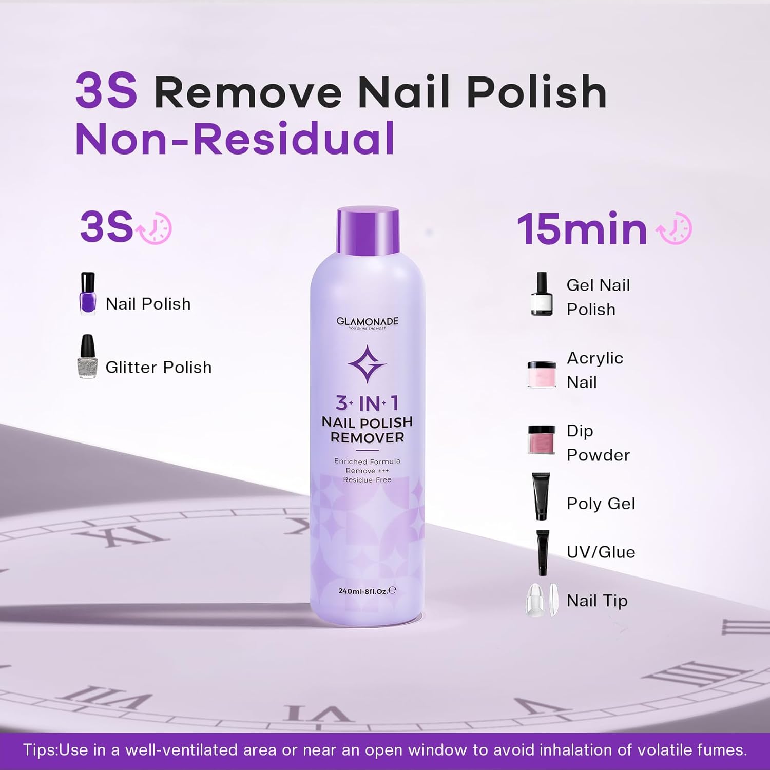 - Triple-Action Formula Nail Care: 3-in-1 gel nail polish remover with a complimentary flip-top cap for anti-evaporation and spill-resistant properties. Acrylic remover for nails quickly removes 99% of gel nail polish, enriched with grape seed oil for clean, moisturizes nails that stay shine and non-drying.