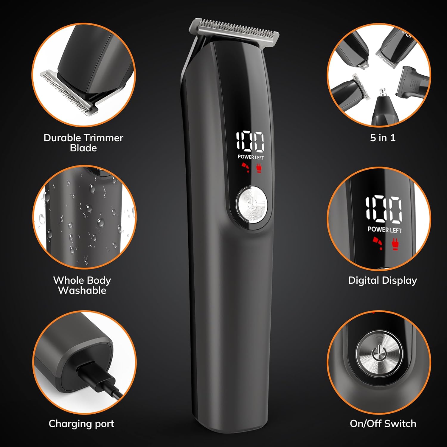 - Professional Beard Trimmer and Hair Clipper Set: Designed for precise beard trimming, the Ynasen all-in-one set includes 5 trimmer heads, a comb, and a stand base for easy organization. It also comes with 5 hair trimming combs, allowing you to control the length and style of your beard, body, face, nose, ears, eyebrows, sideburns, neck, groin, legs
