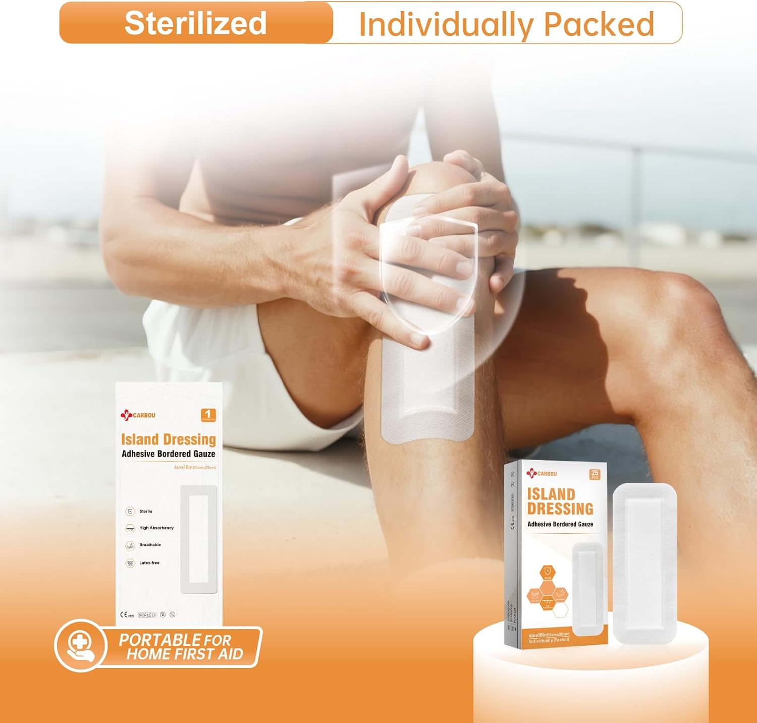 Carbou Island Dressing Bordered Gauze 4"x10" - 25 Sterile Individually Wrapped Pads | Non-Stick Center with Water-Resistant Adhesive Border | Medical Grade Non-Woven Backing for Wound Care & First Aid