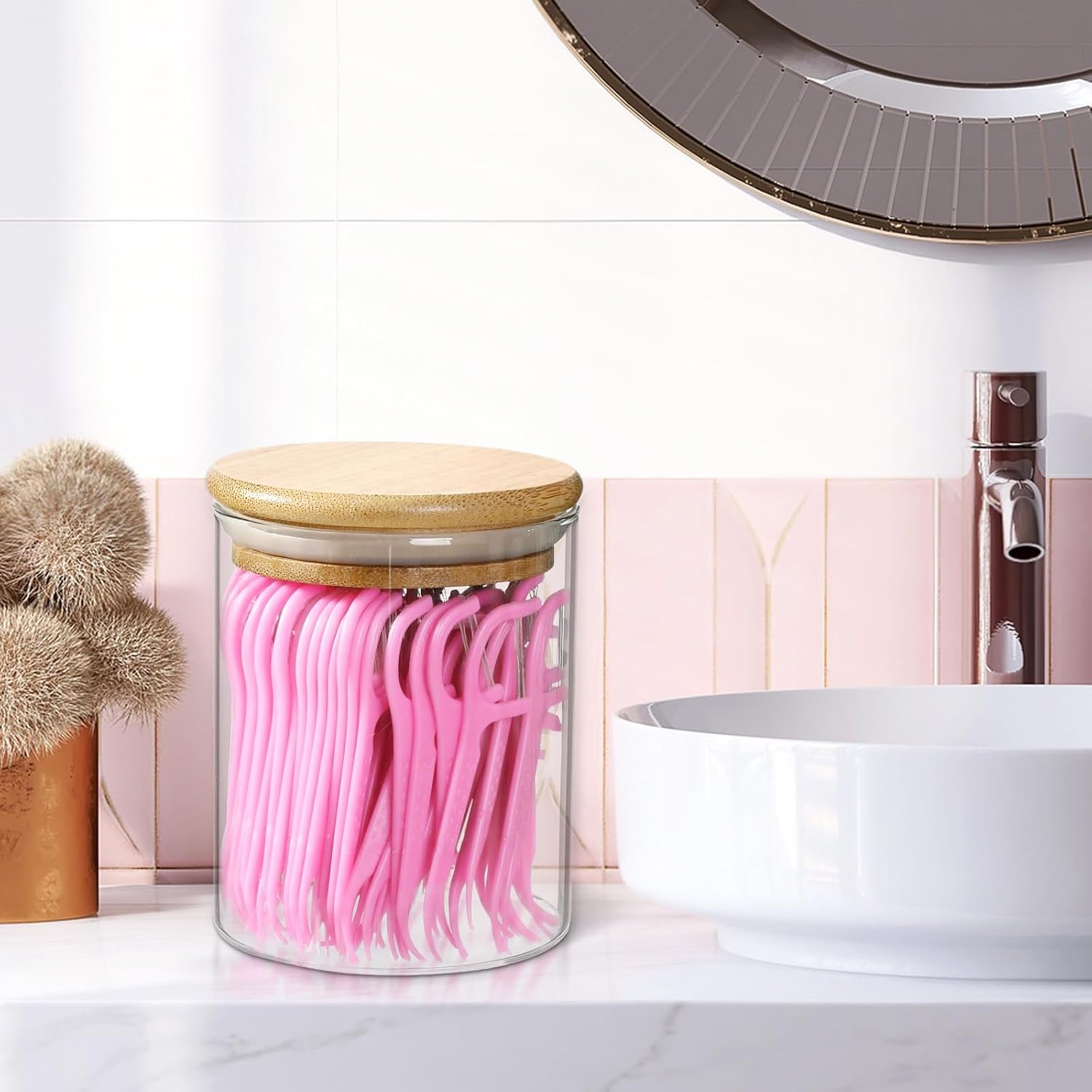 - Multifunctional bathroom apothecary jars: These qtip holders are great for organizing small items, very easy to store and take out, this bathroom vanity qtip holder can perfectly organize cotton swabs, cotton pads or cotton balls, hair ties, dental floss sticks, toothbrush heads, small accessories, and other small items around the home.