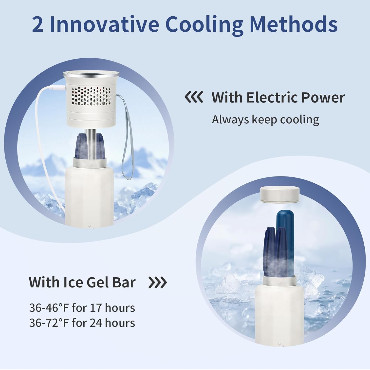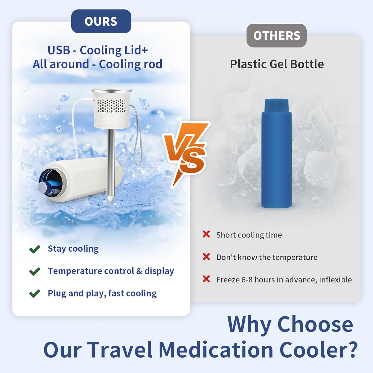 - Insulin Travel Case with 2 Cooling Methods: 1) USB-powered cooling lid provides rapid cooling, while the cooling rod distributes cold air evenly for all-around temperature control. 2) Freeze the blue ice gel packs for 5–8 hours before travel. Place them with medications in the insulated cup to maintain 36–72°F for 24 hours. (Note: If ice gel packs are over-frozen, briefly warm them in lukewarm water to avoid medication damage.)