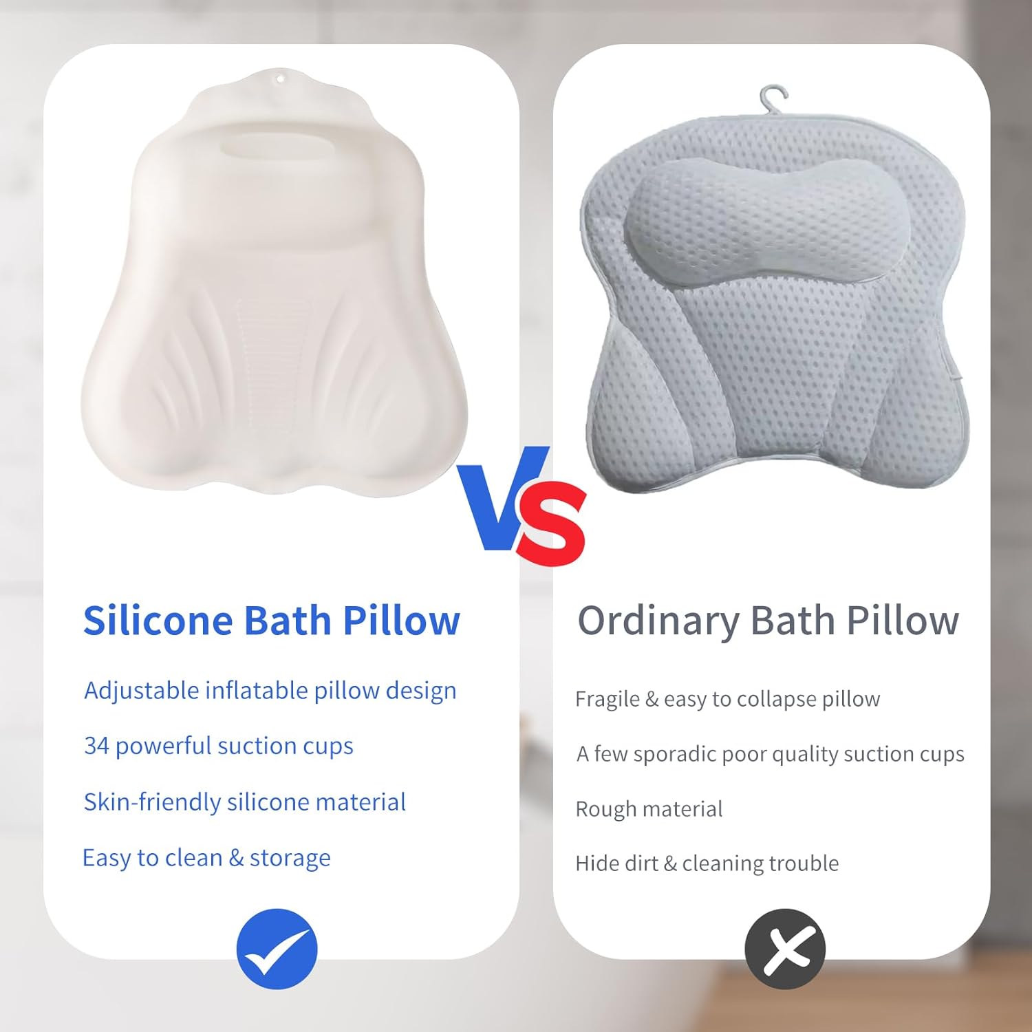 - [FLEXIBLE INFLATABLE BATH PILLOW]: This silicone bathtub pillow is ergonomically designed with a press-fit inflatable pillow design, which allows you to adjust the height of the bath pillow by releasing the gas to achieve a comfortable height; the flexible airbag bath tub pillow better supports your head and neck! (Tip: It is recommended not to over-inflate, it will affect the comfort level)