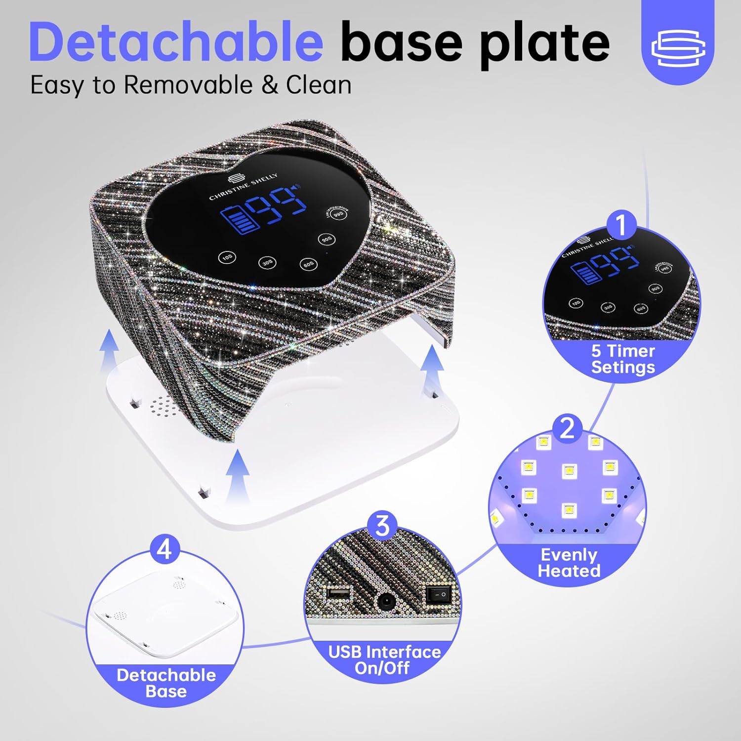 - 【Quick Drying Curing for Superior Nail Care】The CHRISTINE SHELLY sparkly nail lamp is the ultimate solution for optimal nail care. Equipped with 30 dual light source lamp beads, this UV light swiftly cures all types of nail gel brands, including Base Coat, Top Coat, Color Gel, Hard Gels, Poly Gels, Builder, Acrylic, Sculpture gel, and gem glue. Say farewell to harsh lights that can harm your eyes and hands .You can indulge in top-notch salon manicures from the comfort of your own home