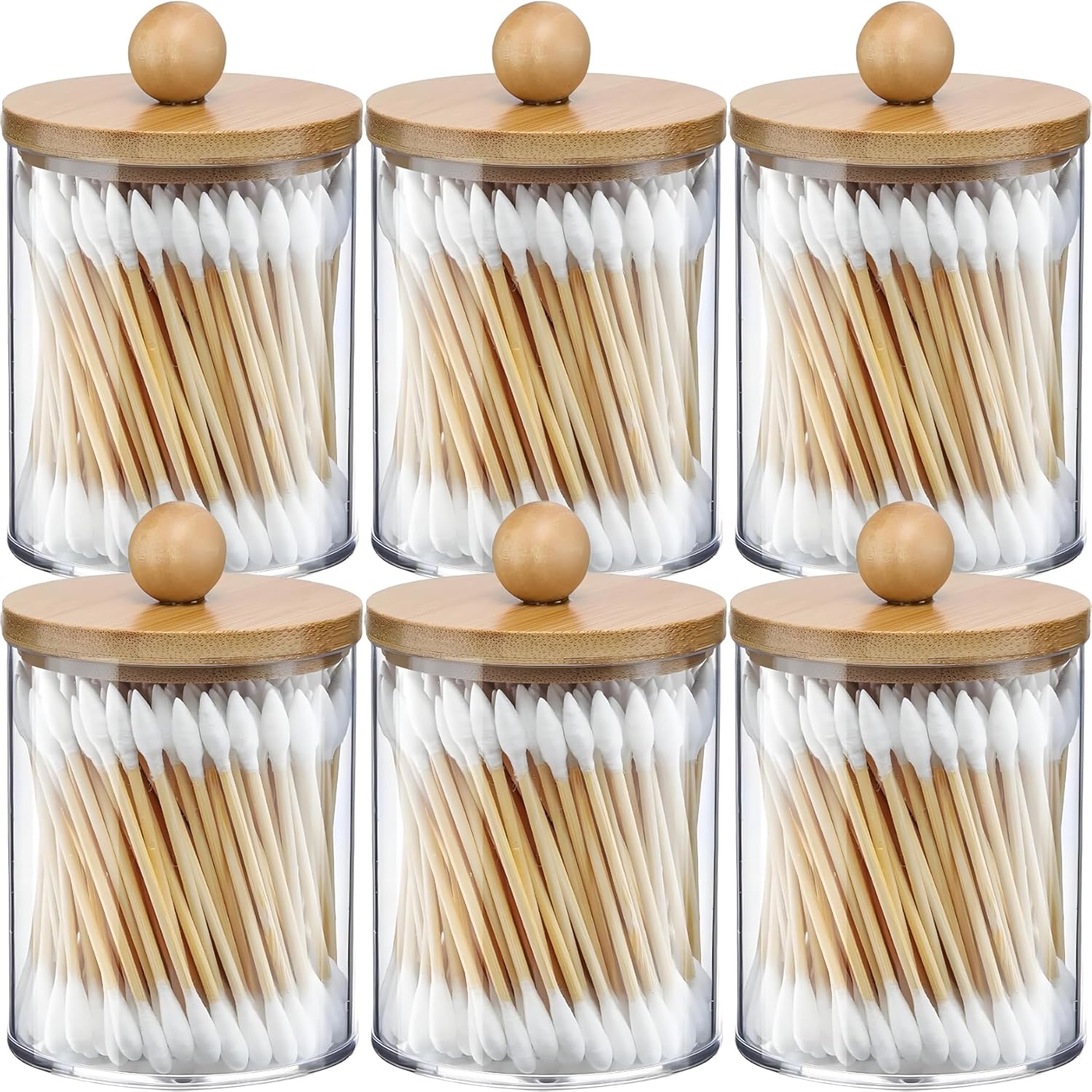 AXX Qtip Dispenser Apothecary Jars Bathroom - Qtip Holder Storage Canister Clear Plastic Jar for Cotton Swab,Q-Tips,Cotton Rounds (Bamboo 6Pcs)