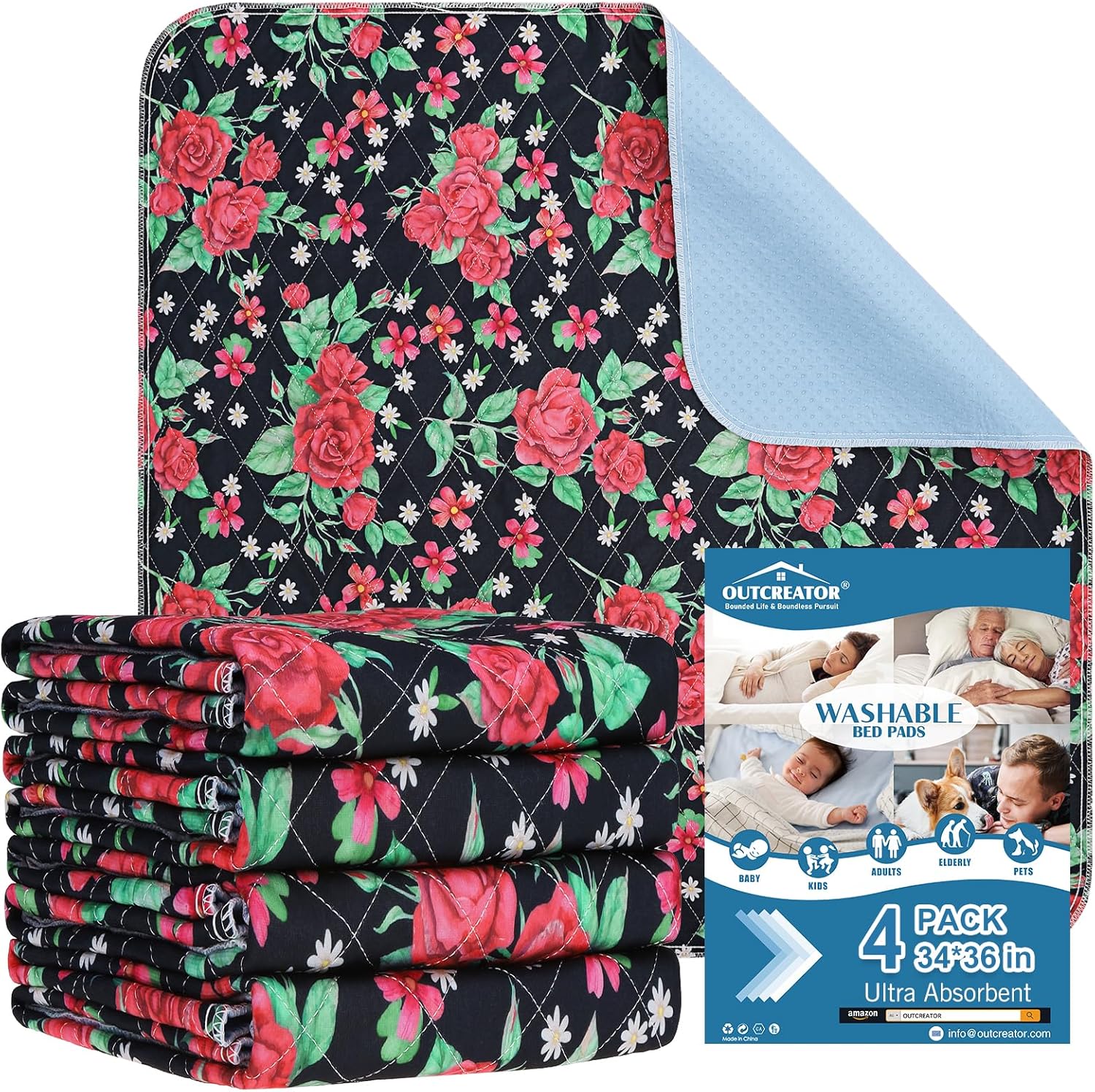 OUTCREATOR® Washable Bed Pads 34" x 36" (Pack of 4), Incontinence Mattress Protector, Anti-Slip Waterproof Underpads for Adults Kids Elderly Pets, Absorbency & Reusable Bedwetting Pads (Red Flower)