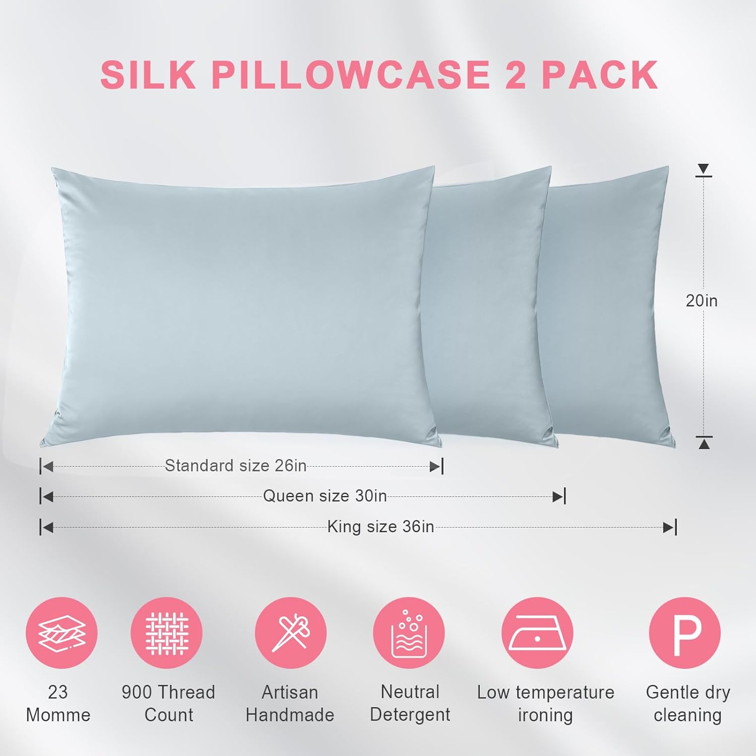 100% Silk Pillowcase 2 Pack for Hair and Skin, Both Sides 23 Momme Grade 6A+ Mulberry Silk Pillowcases with Hidden Zipper, Soft&Smooth Cooling Pillow Cases (Ash Blue, Queen 20×30)