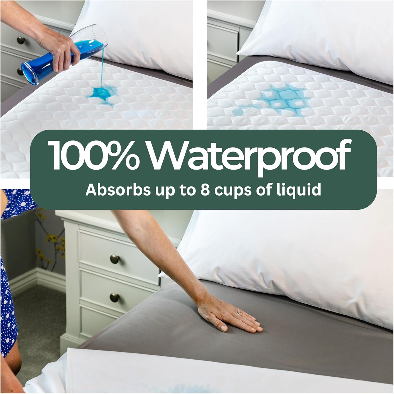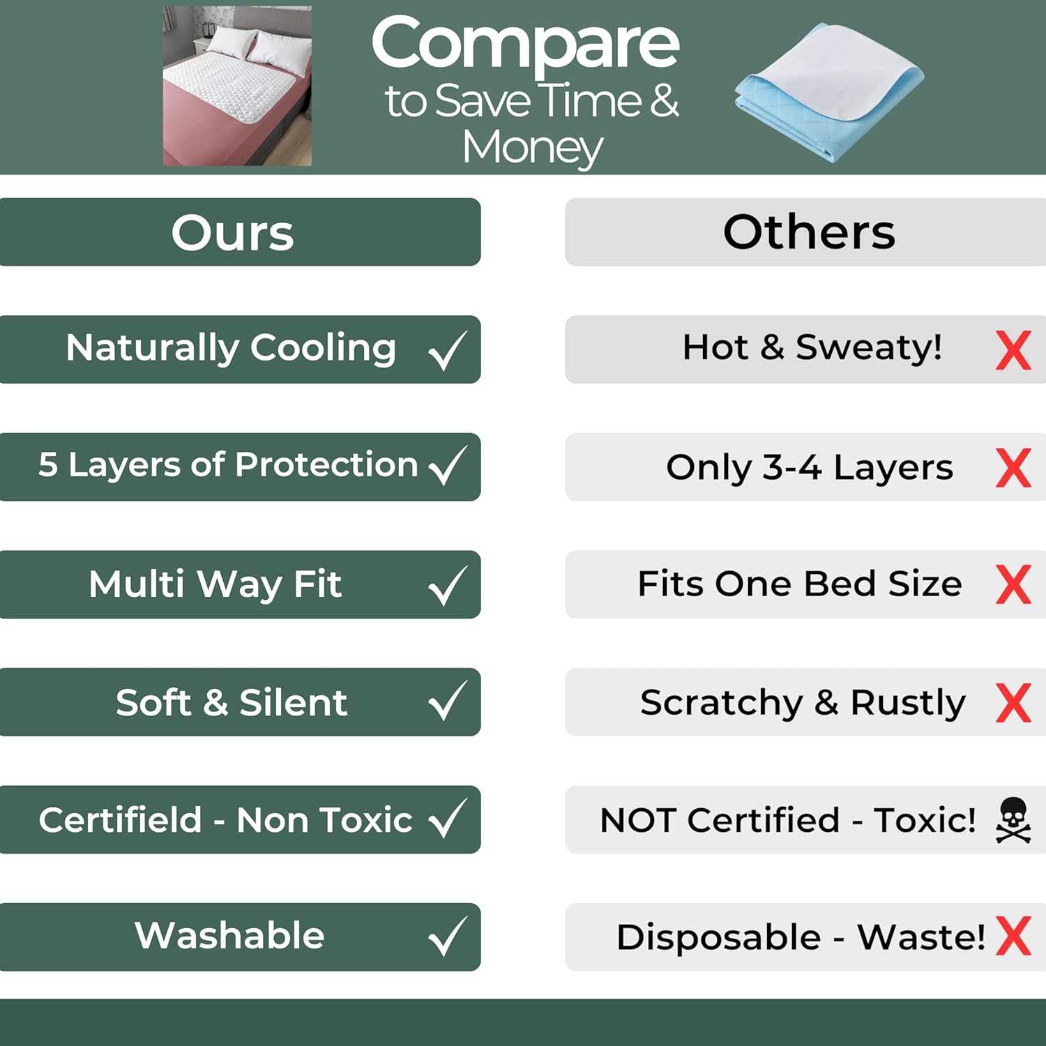 - 🐼 MAXIMUM ABSORBENCY: Our pads for beds for incontinence adults are 100% waterproof and designed for maximum absorption. They uniquely have 5 layers of protection including - cool and soft comfort layer, two super absorbent layers, a waterproof barrier and a non-slip backing. The bedwetting pads are 52" x 34".