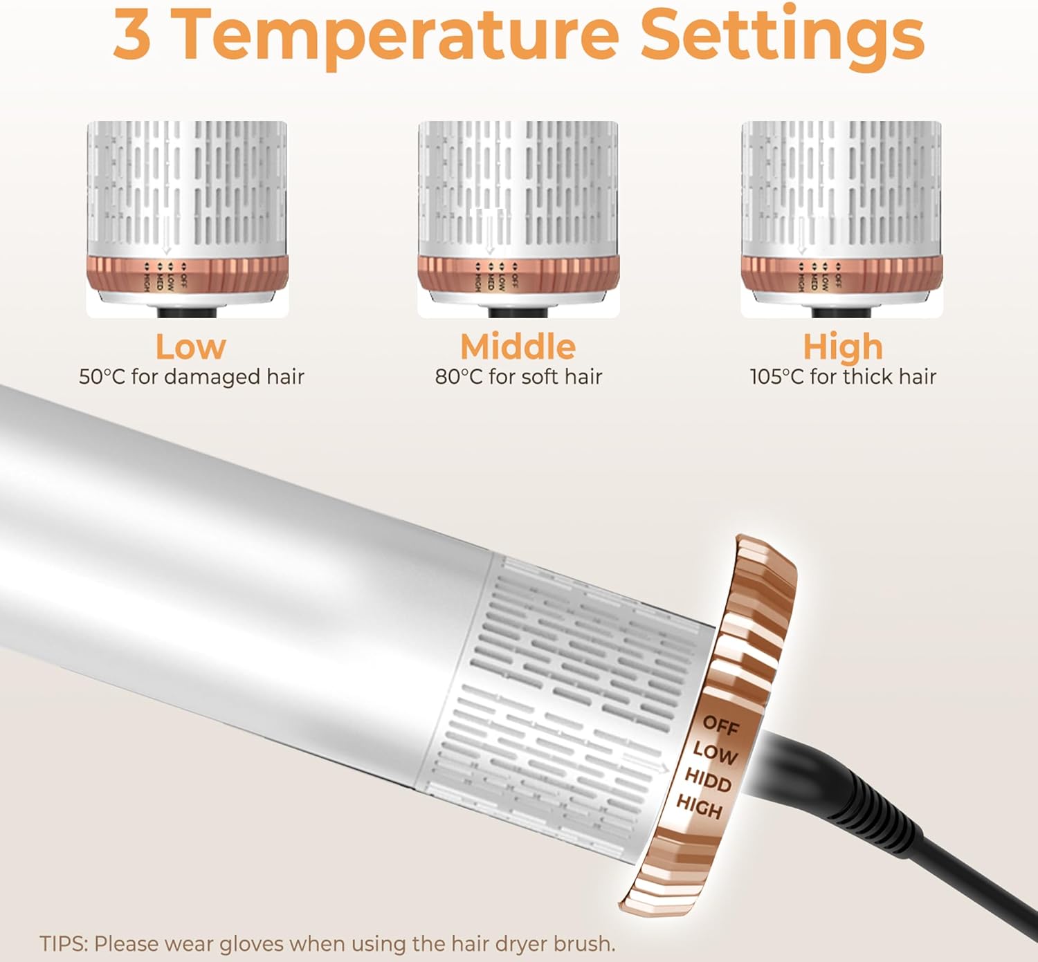 - 3 TEMPERTURE SETTING FOR ALL HAIR: Blowdryers brush for hair supplies 3 temperature settings to adjust the heat. Magic styler is suitable for different hair types. High: quickly shape for thick & pre-dried hair. Middle: Suitable for long-lasting hairstyles you set. Low: Suitable for fine, soft, damaged & treated hair. The Hair brush blow dryer can effectively dry hair without damaging the hair, and it is flexible to set various hairstyles you want. Choose the best temperature for your hair.