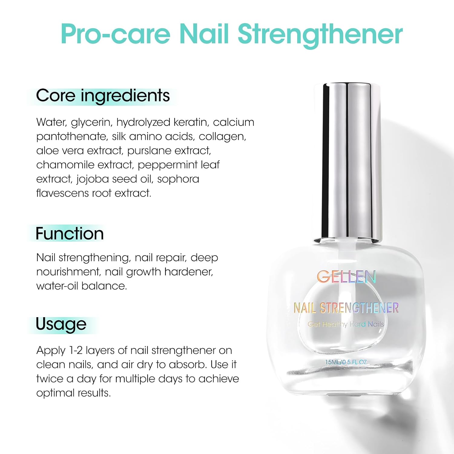 - Pro Care Nail Strengthener & Fragrance-free for Sensitive Nails: Gellen 8-in-1 Nail Strengthener is specifically formulated to strengthen damaged nails, repair soft and weak nails, promote nail growth, and provide nourishment. Added multiple nourishing extracts to support healthy nail growth from the roots. Itβs an excellent everyday nail care solution, especially for nail repair after gel polish removal.