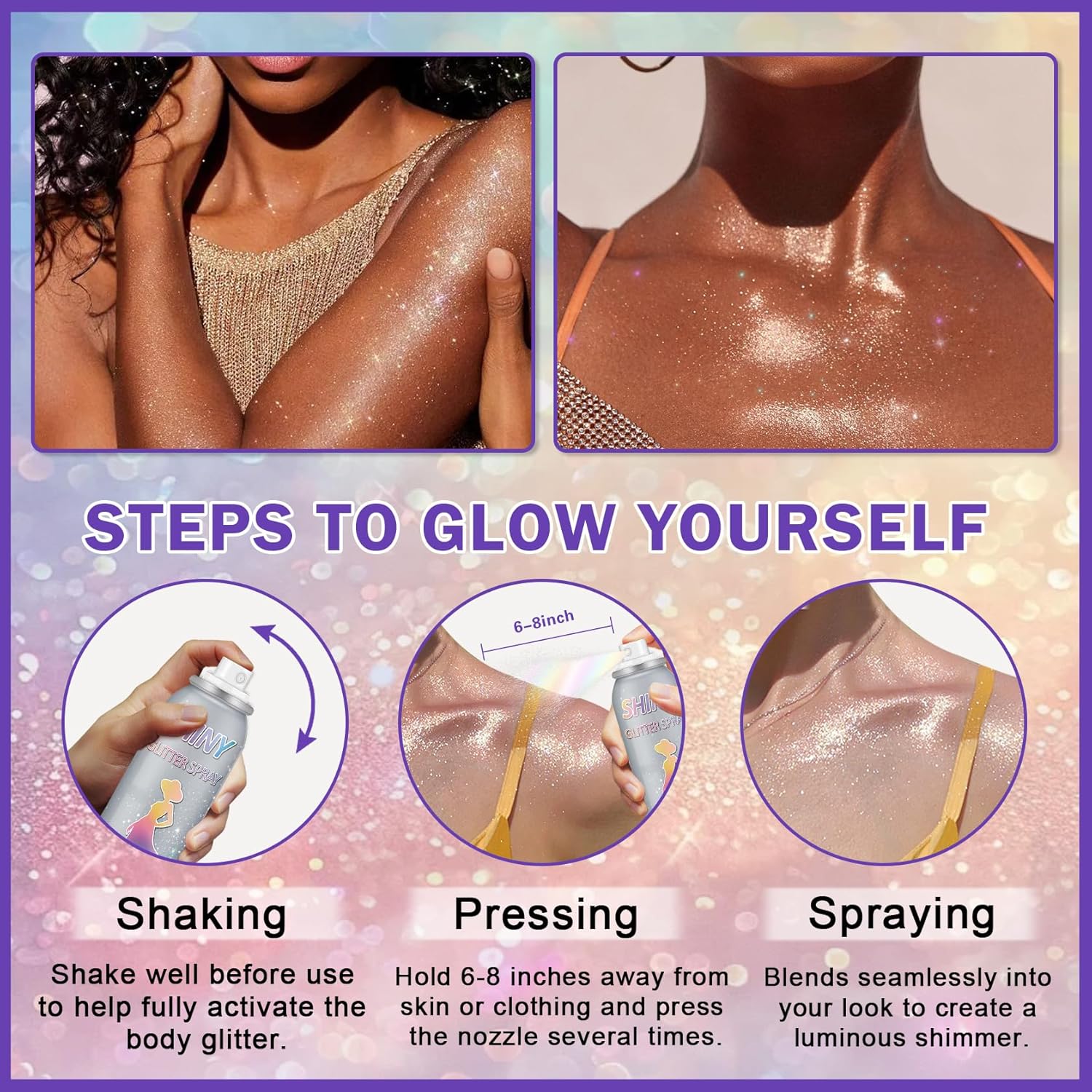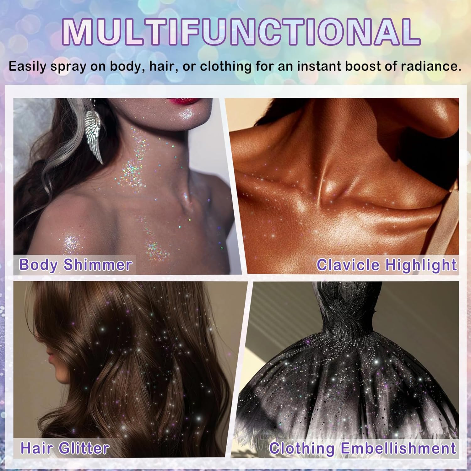 - 【Body Glitter Spray】Lightweight and breathable texture,easily sprays onto body,hair,or clothing.Instantly enhances radiance and creates multidimensional shimmer effects,adding dazzling charm to your look