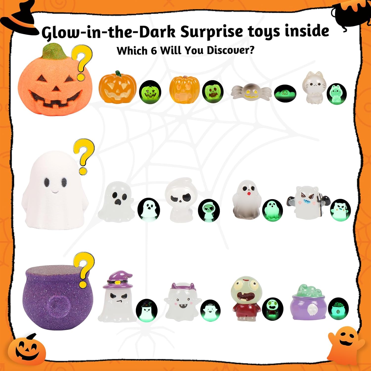 - 12 Glow Toys to Collect: Each bath bomb hides a surprise glow-in-the-dark Halloween toy. From 12 spooky styles, kids randomly discover 6—pumpkins, spider, ghosts, skeletons, etc, that lights up kids’ imagination long after the fizz fades, making bath time a thrilling discovery.