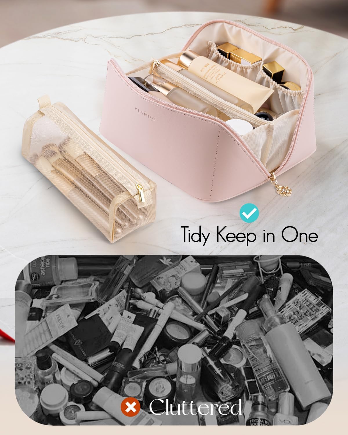 Vlando Makeup Bag,Large Capacity Travel Toiletry Bag,Cosmetic Bags for Women PU Leather Waterproof Portable Pouch with Divider & Handle-Pink