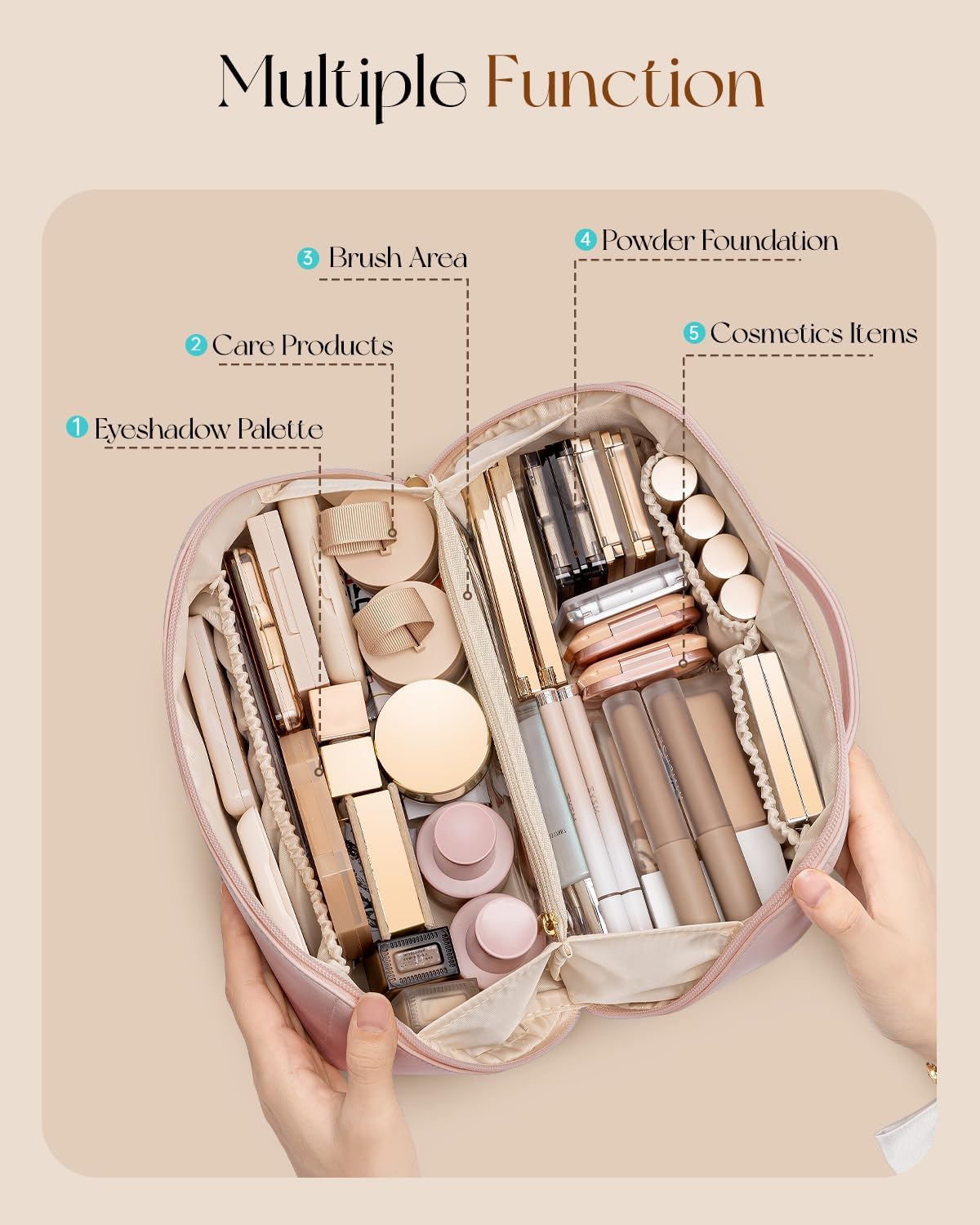 - Versatile Compartment: 2 large compartments and 3 elastic pockets neatly organize your makeup, while the middle zippered TPU pocket is perfect for small items and jewelry. Extra portable pouch keeps your keep brushes neatly stored and visible
